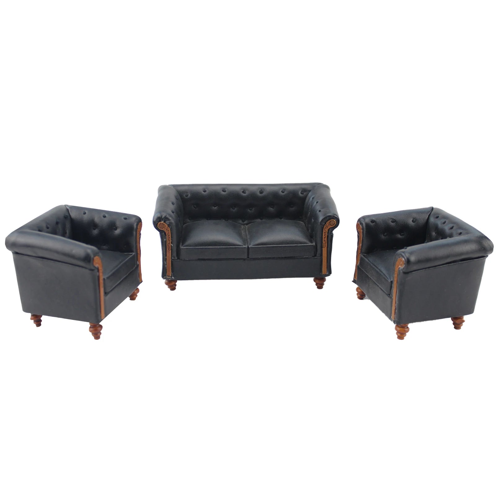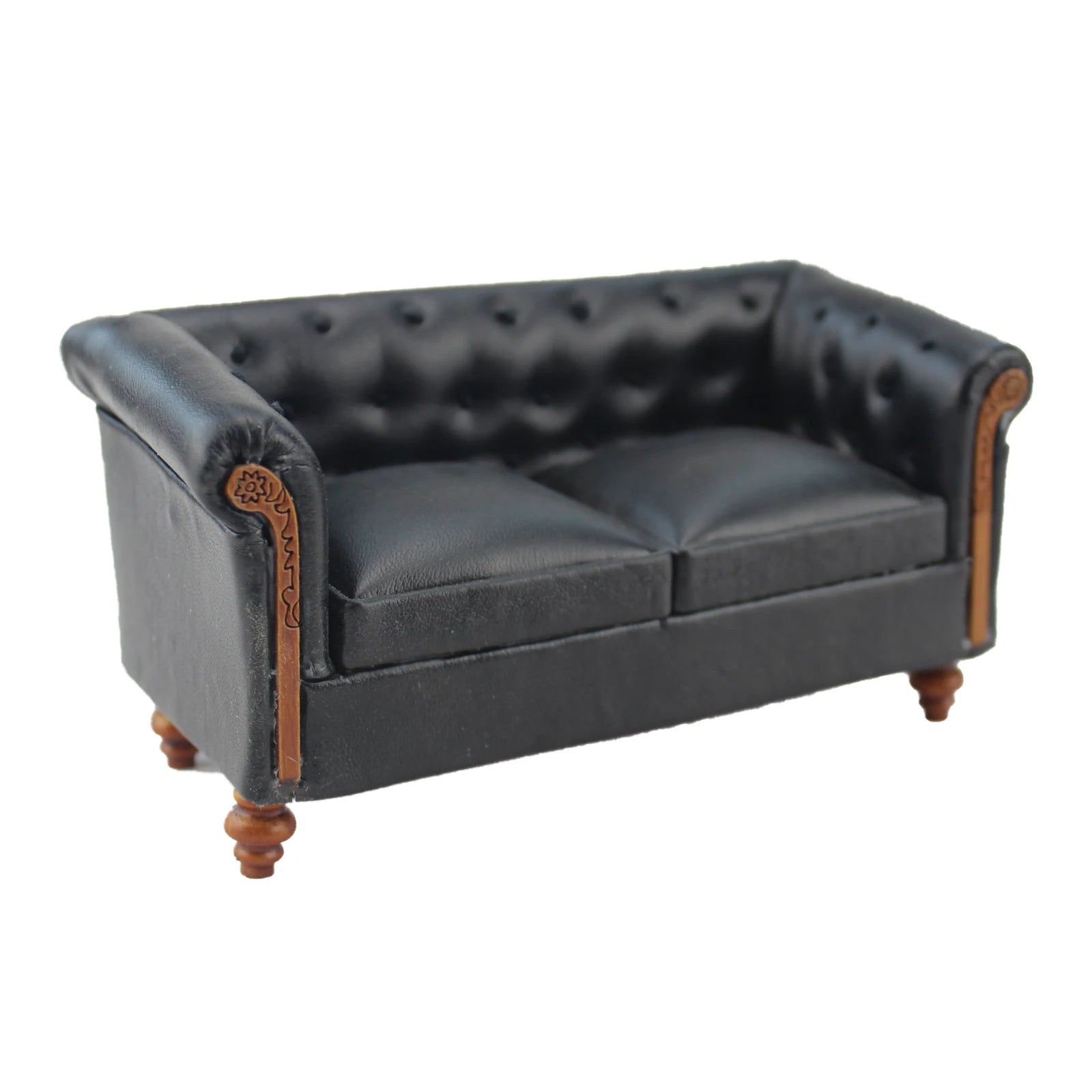 Sofá en miniatura a escala 1:12 hecho a mano con tapizado de cuero sintético negro, perfecto para exhibiciones de casas de muñecas.