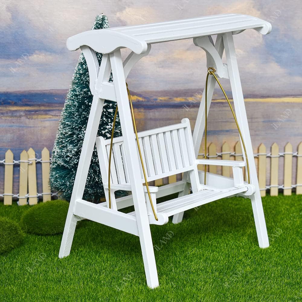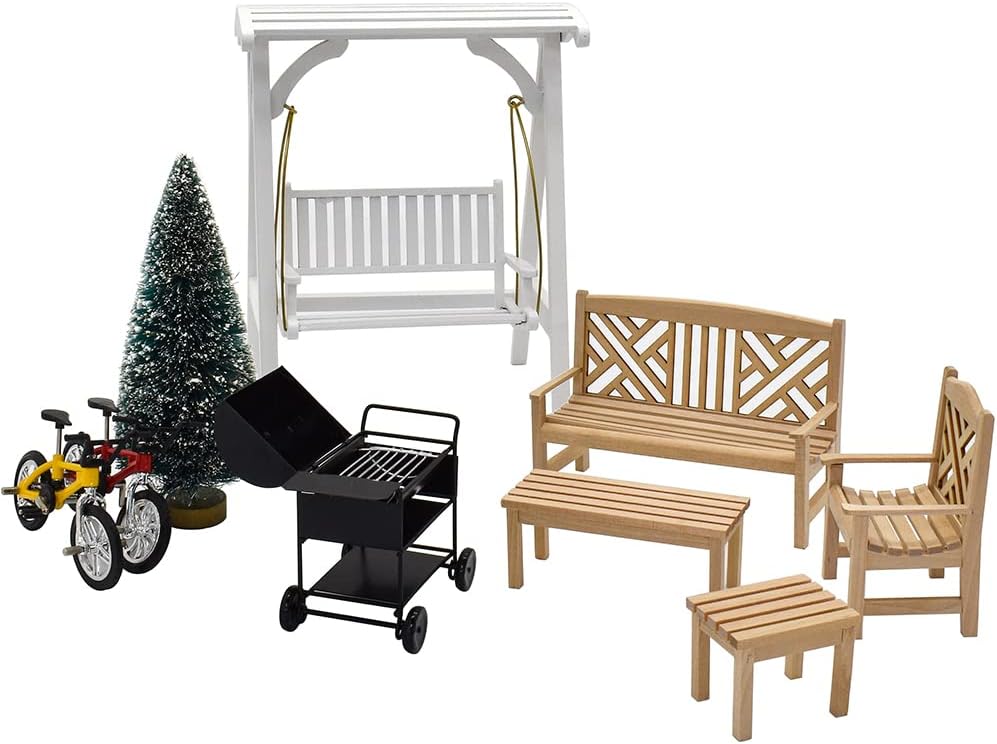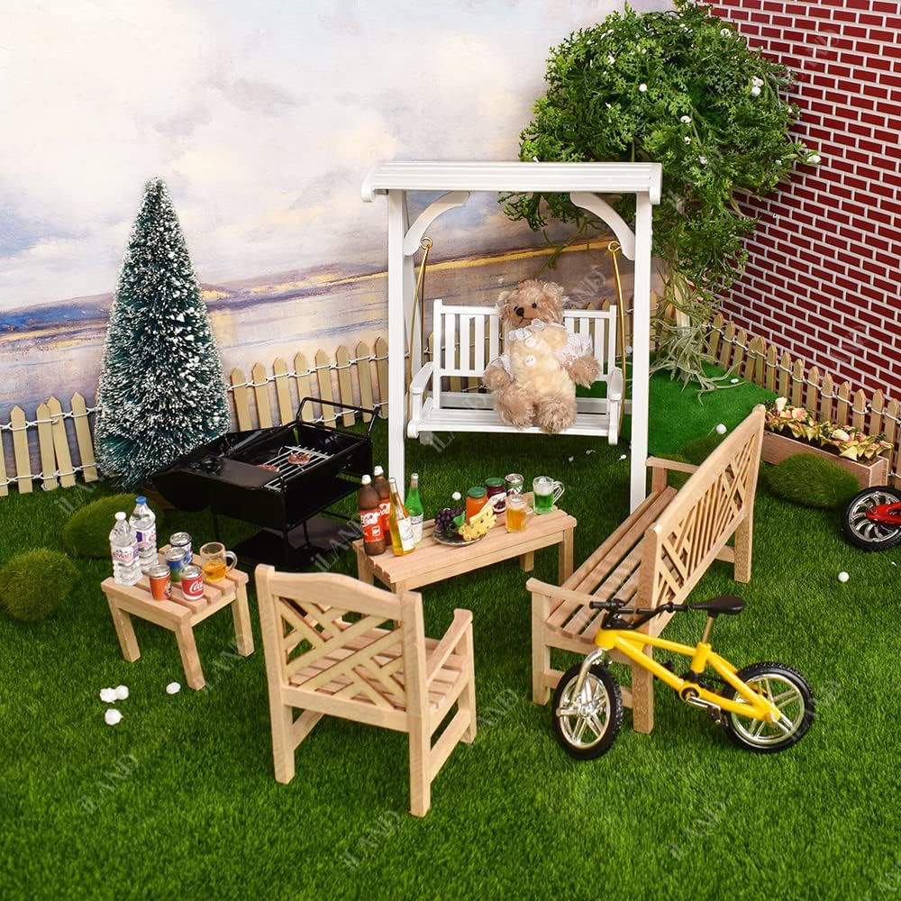 Conjunto de muebles para casa de muñecas a escala 1:12: columpio en miniatura, mesas de patio, sillas y parrilla de carbón - Colección de jardín de hadas de 9 piezas