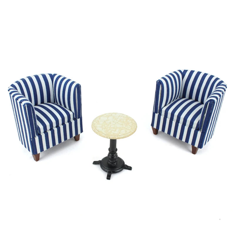 Conjunto de muebles para casa de muñecas a escala 1:12: sillas de tela a rayas y mesa redonda