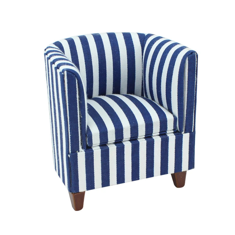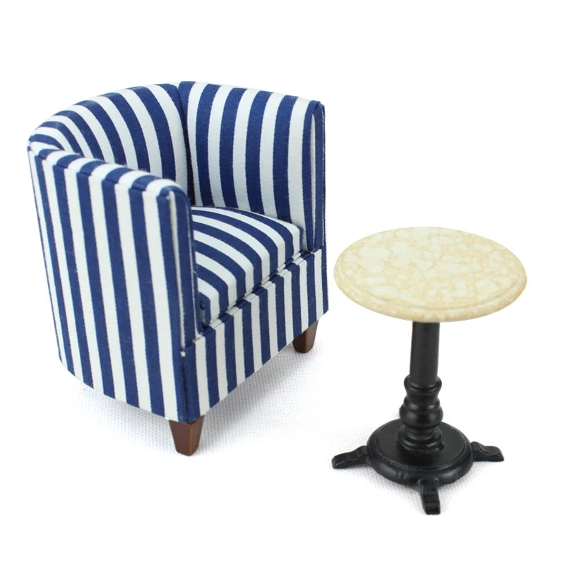 Un delicado conjunto de muebles para casa de muñecas a escala 1:12 que incluye una silla de tela a rayas y una mesa redonda. Perfecto para exhibiciones de miniaturas y decoración de casas de muñecas.