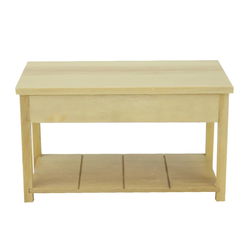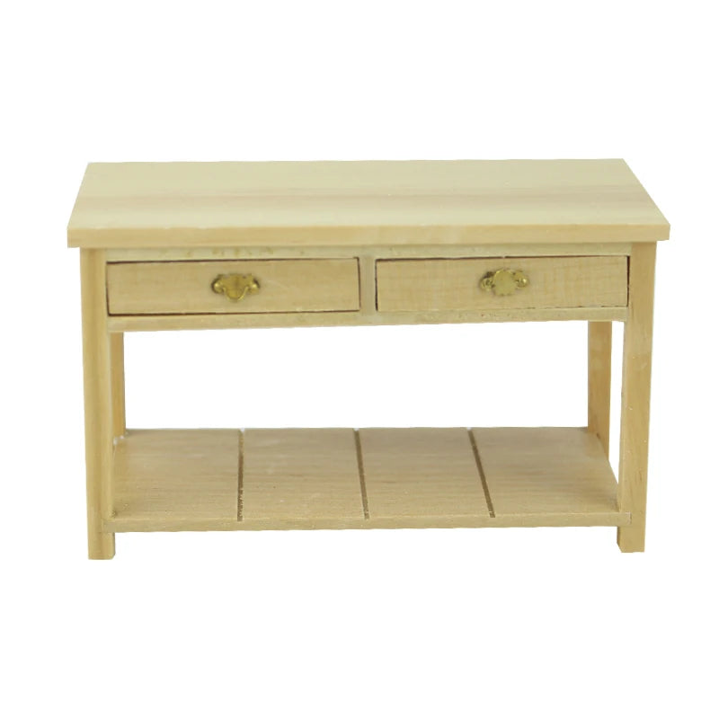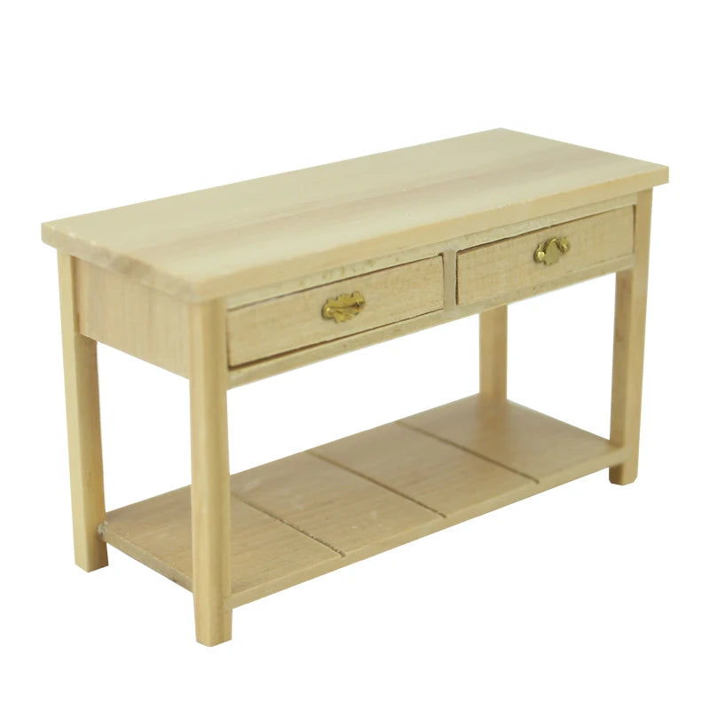 Un escritorio de madera en miniatura a escala 1:12, elaborado con precisión, para exhibiciones en casas de muñecas. Este delicado mueble presenta una construcción de madera auténtica con detalles realistas.