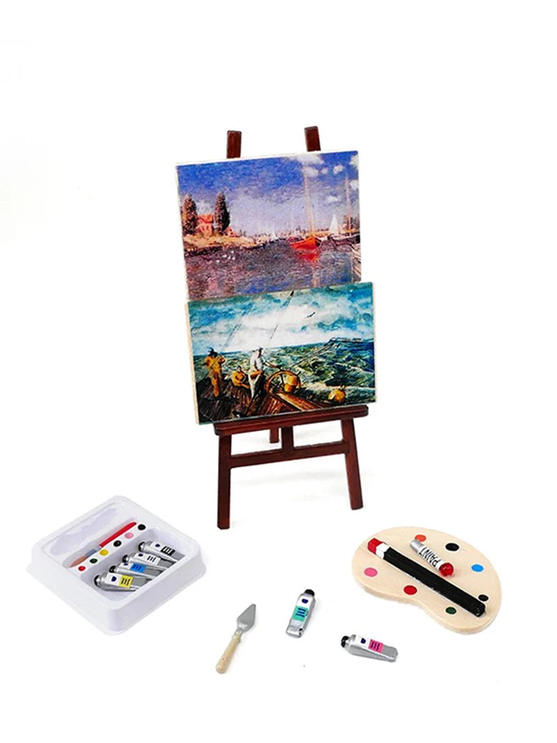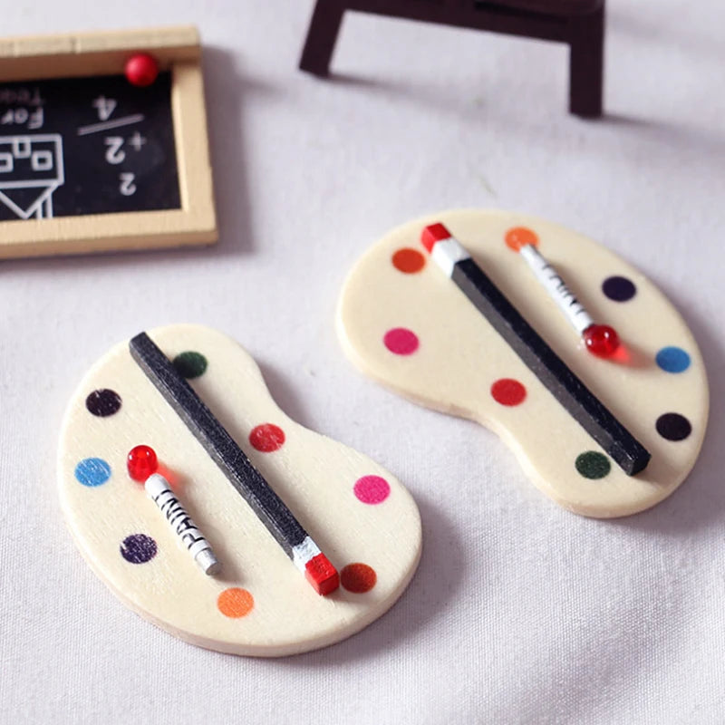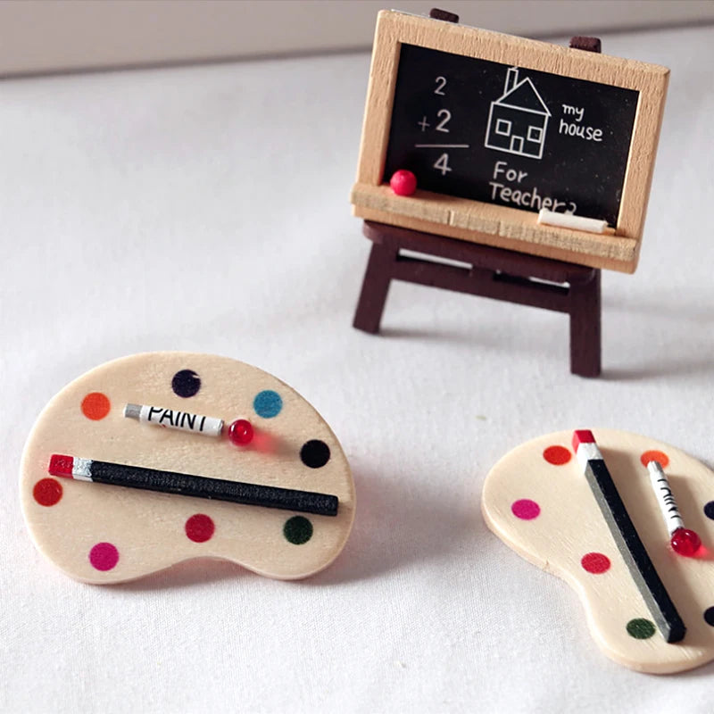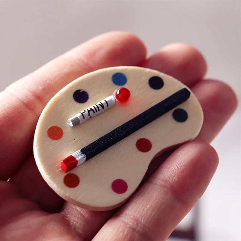 Paleta de pintura y pincel para artistas en miniatura a escala 1:12, accesorio para casa de muñecas