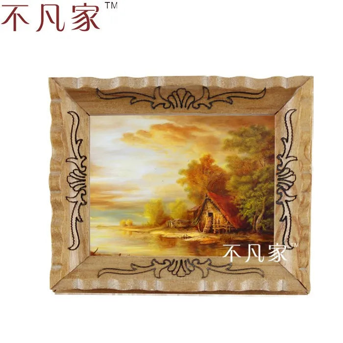 Decoración de casa de muñecas en miniatura a escala 1:12: Pintura al óleo clásica de una casita con un arroyo en un marco ornamentado.