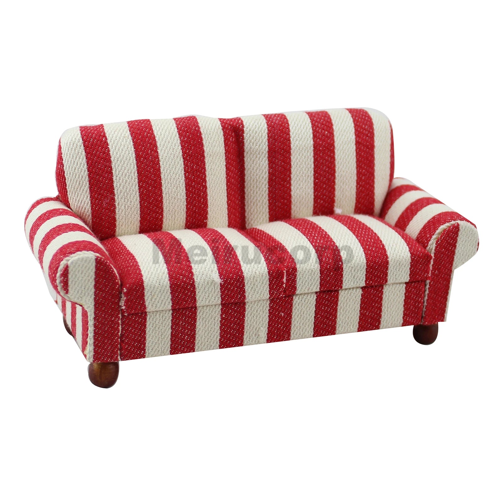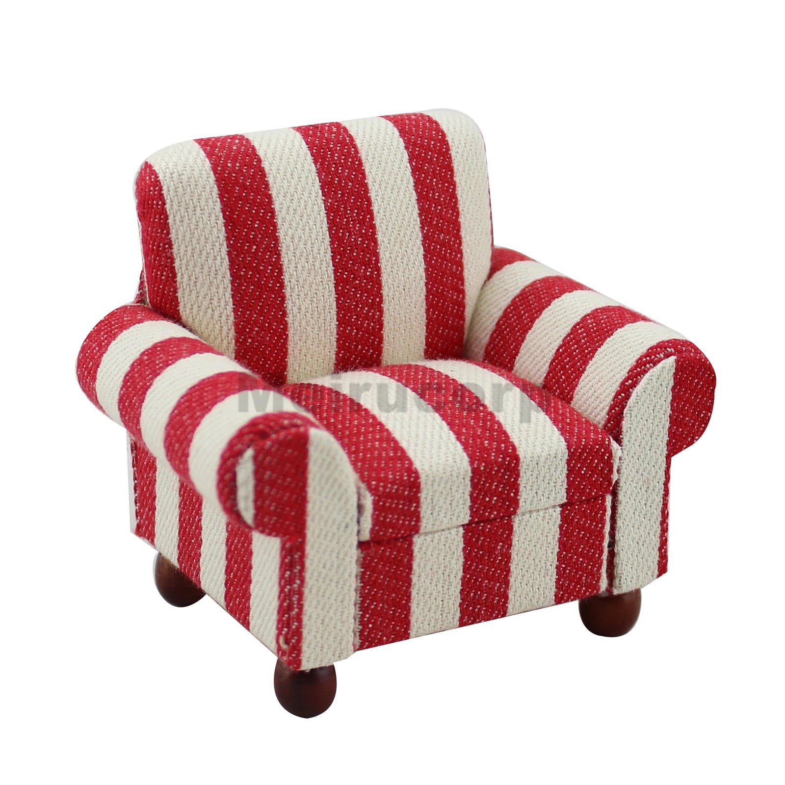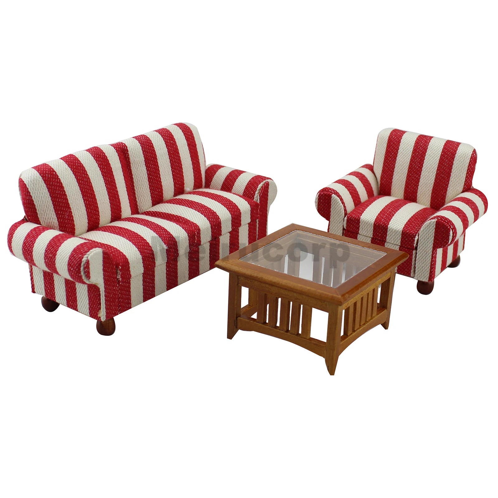 Juego de muebles en miniatura para amantes de las casas de muñecas. Conjunto de 3 piezas de silla y sofá de tela a rayas a escala 1:12, perfecto para decorar el salón. Construcción artesanal de madera con medidas precisas para crear miniaturas realistas.