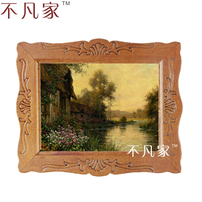 Una hermosa pintura al óleo en miniatura a escala 1:12 que representa una escena clásica de pueblo con un arroyo. Perfecta para decorar casas de muñecas y exhibiciones de miniaturas.