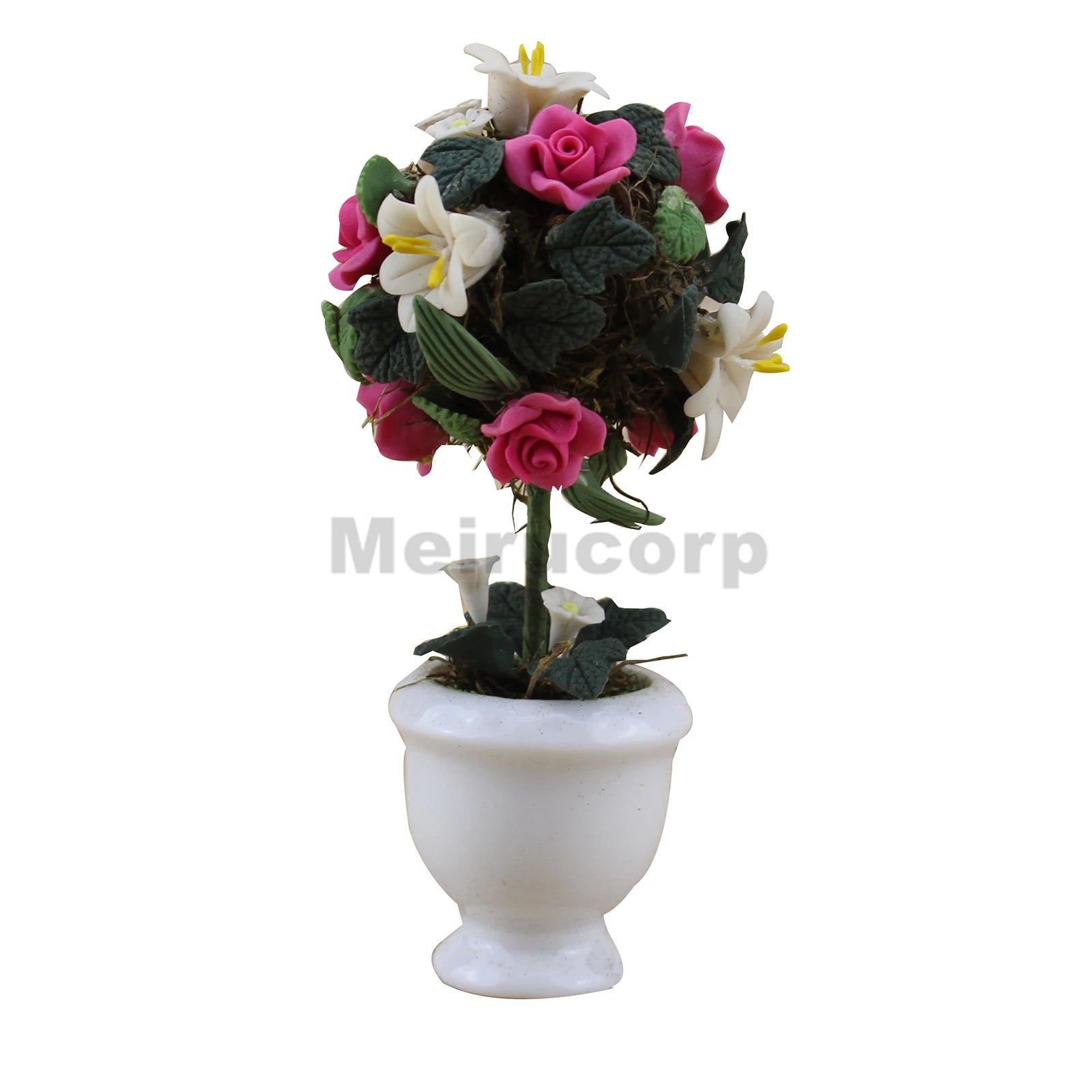 Casa de muñecas en miniatura a escala 1:12 con rosal rosa en maceta y decoración floral