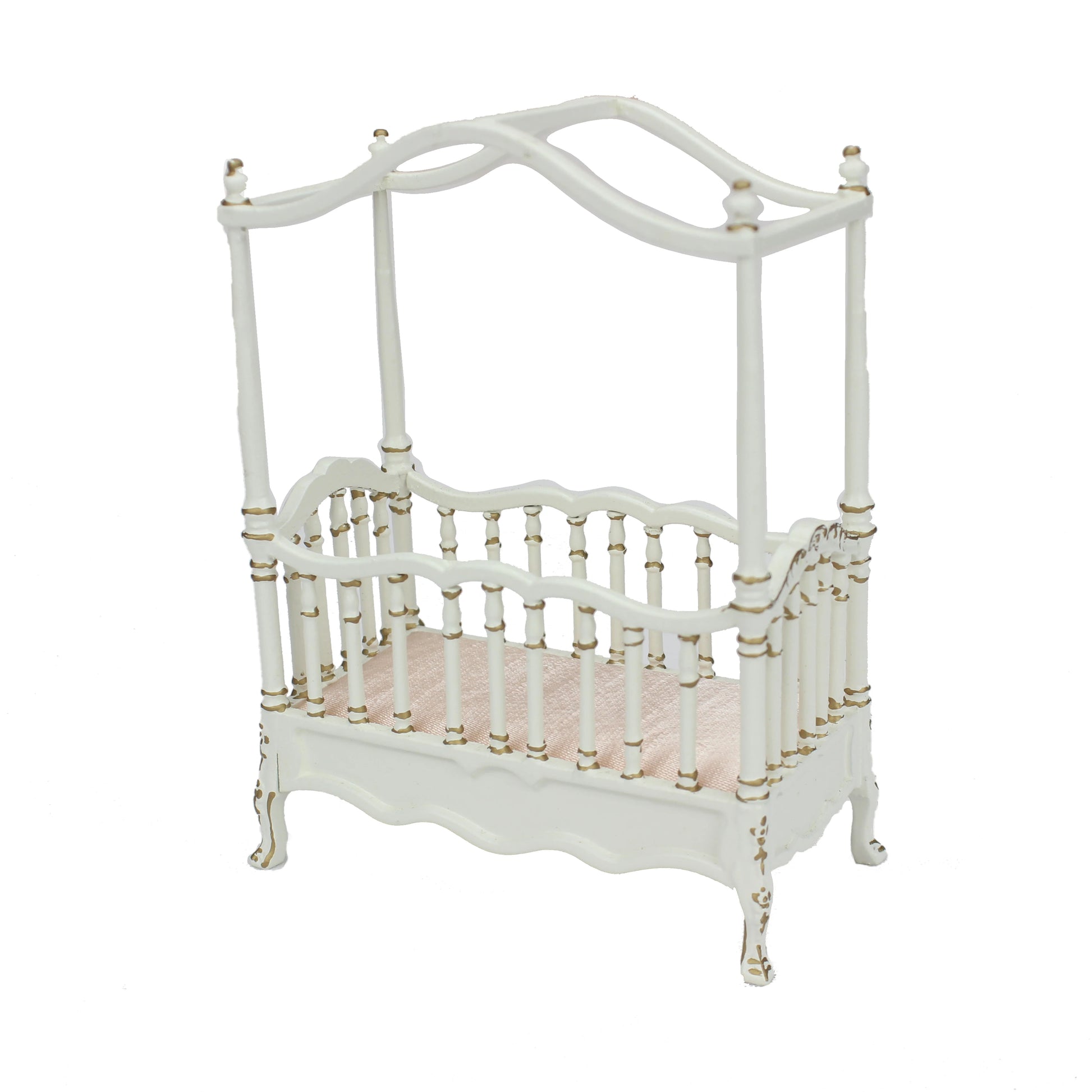 Cuna de bebé blanca con detalles dorados para casa de muñecas en miniatura a escala 1:12.