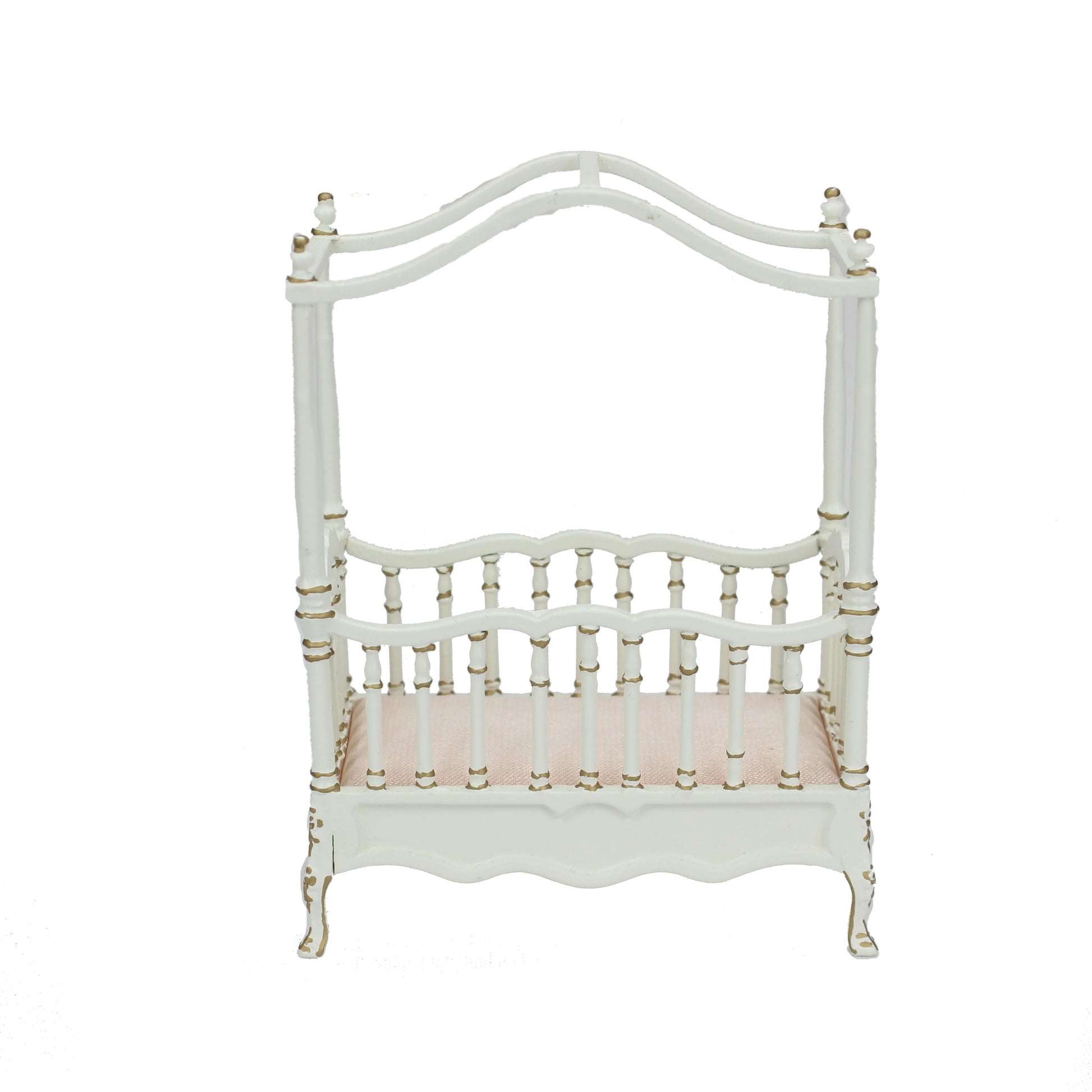 Muebles de casa de muñecas en miniatura, cuna a escala 1:12, cama de muñecas blanca y dorada, accesorios coleccionables para casa de muñecas, muebles en miniatura pintados a mano