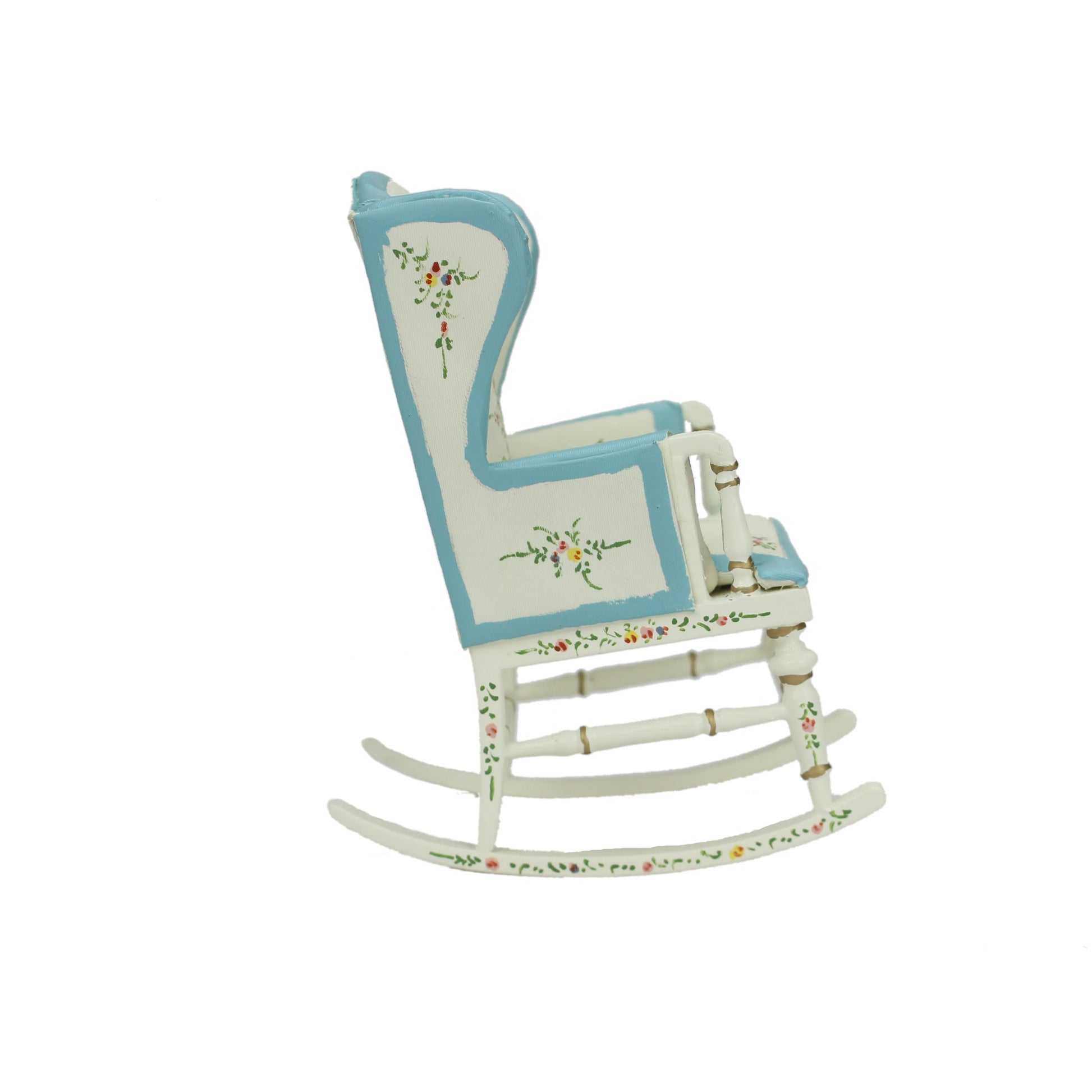 Mecedora de madera en miniatura hecha a mano con acabado pintado en blanco. Diseñada para exhibiciones en casas de muñecas a escala 1:12. Presenta una delicada artesanía con un auténtico mecanismo de balanceo.
