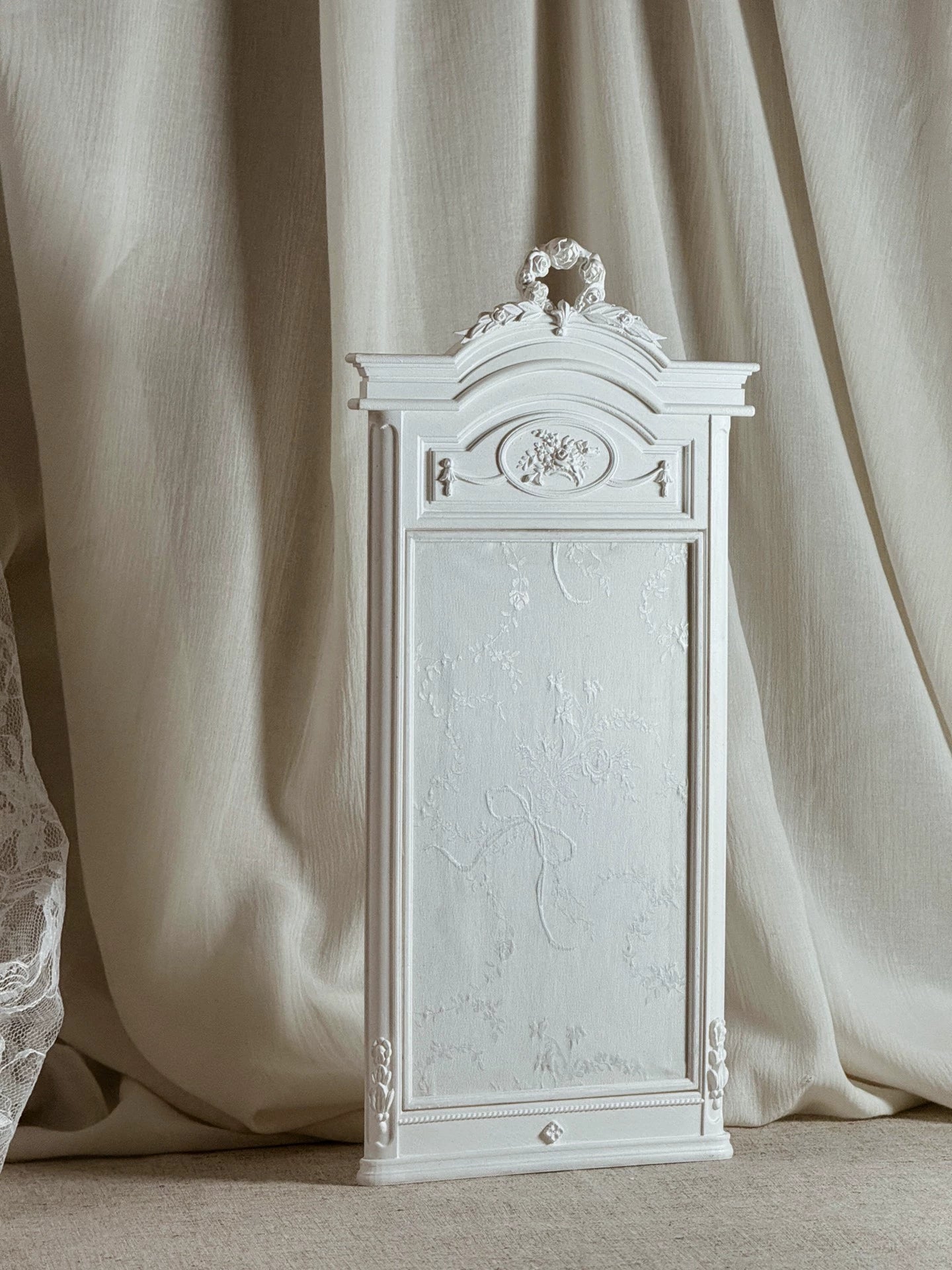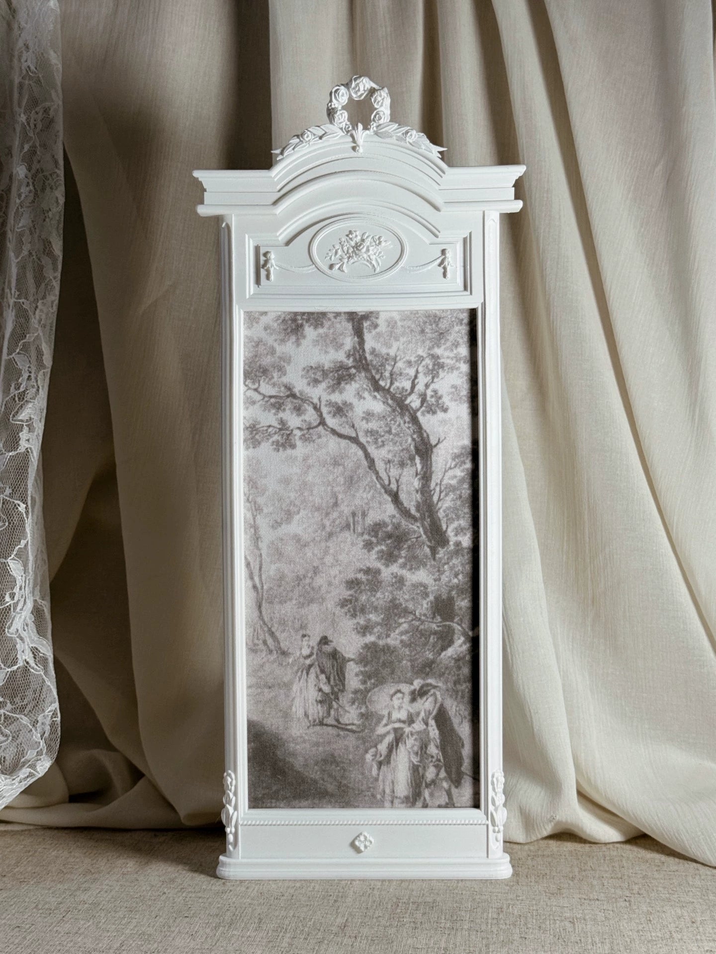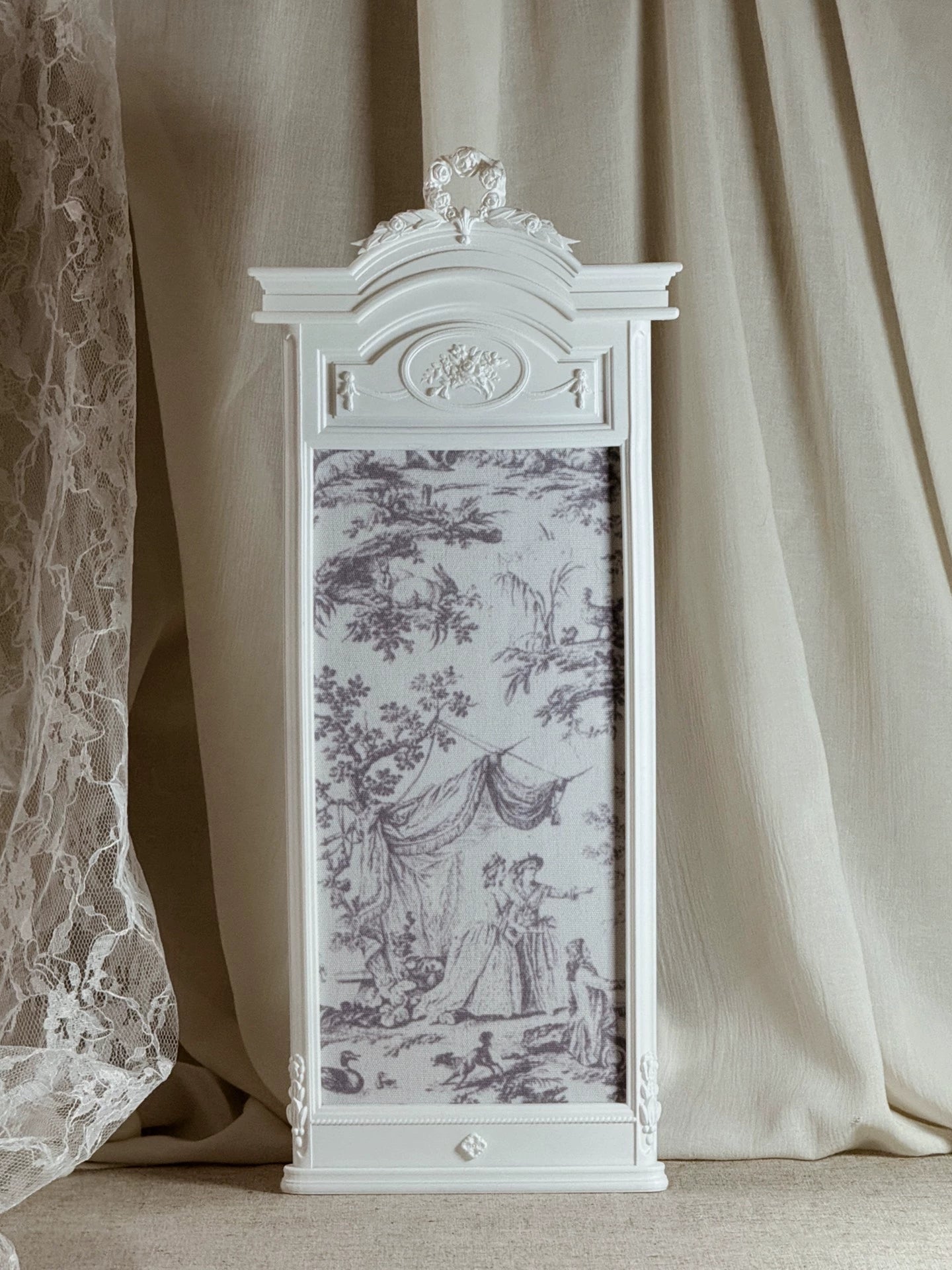 Espejo de pie en miniatura de estilo vintage con intrincados tallados, perfecto para exhibiciones en casas de muñecas y accesorios para muñecas BJD. Disponible en dos escalas estándar con paneles de fondo opcionales para una mejor presentación.