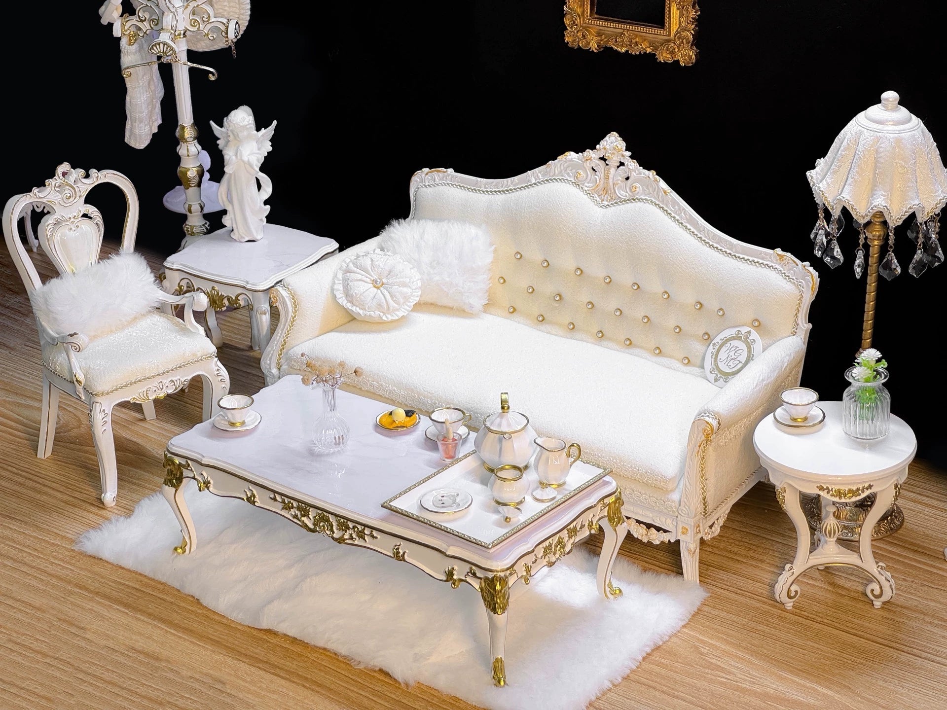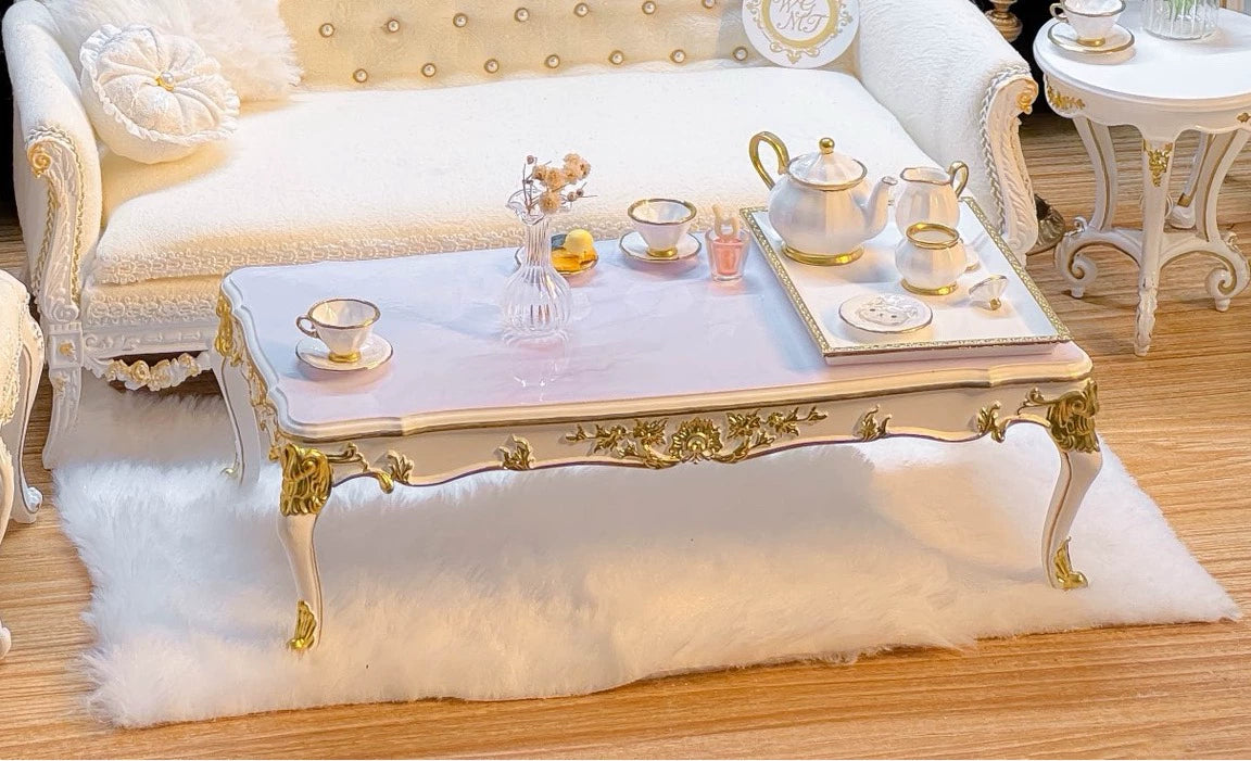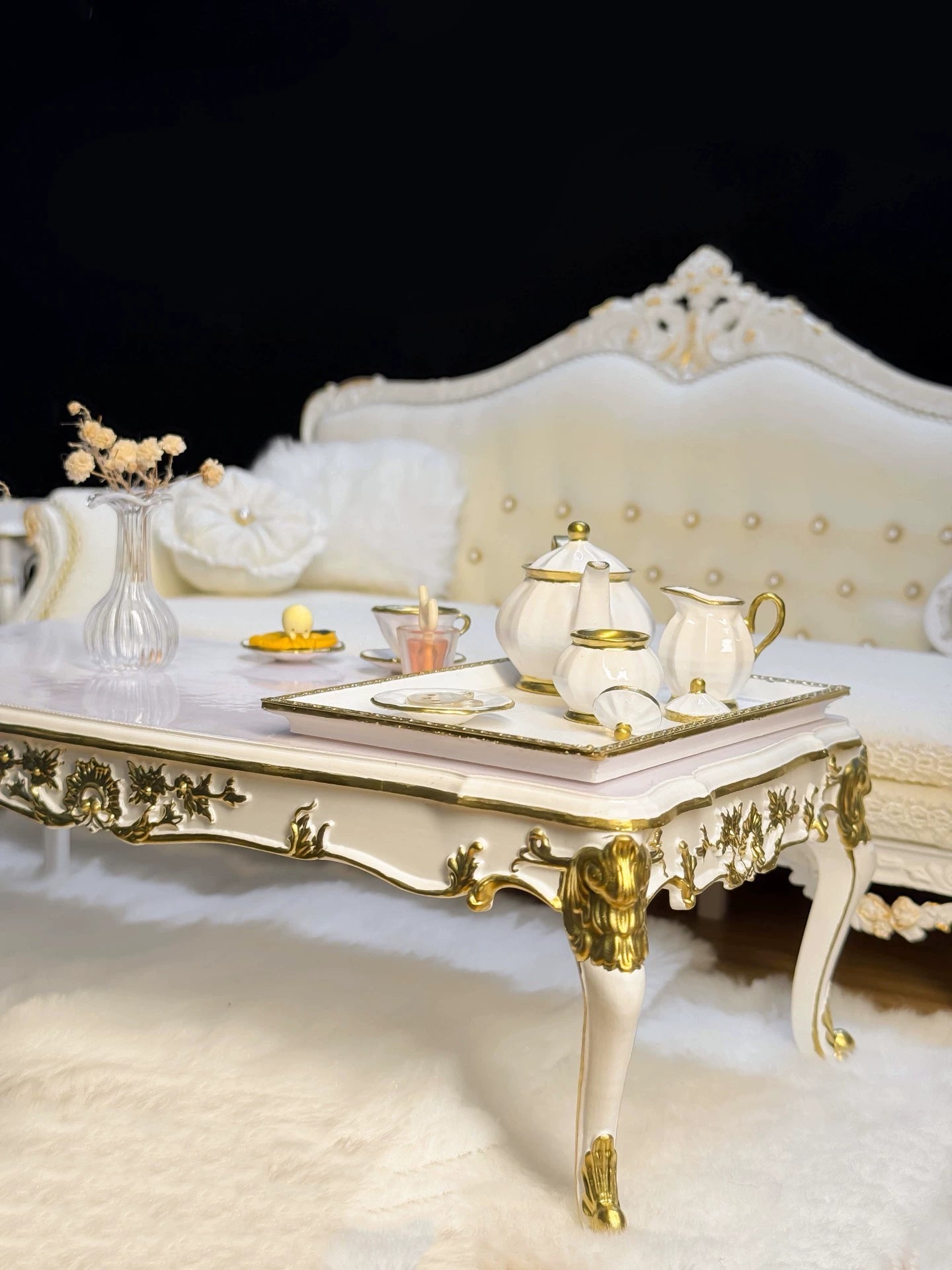 Juego de muebles para casa de muñecas en miniatura, hecho a mano, con tablero de mármol personalizable y accesorios de té completos. Disponible en cuatro escalas precisas para coleccionistas de BJD.