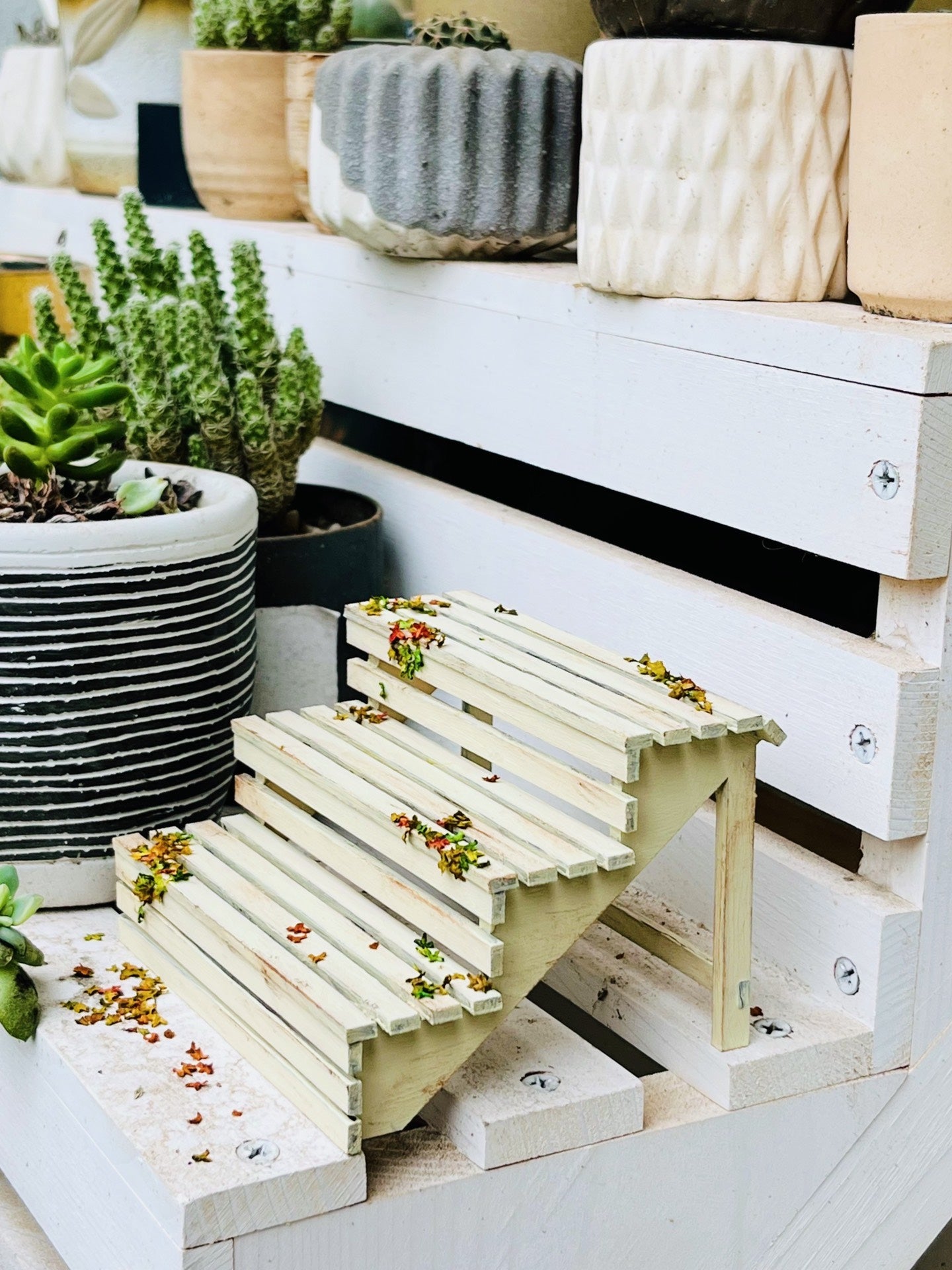 Este es un kit de muebles en miniatura para un puesto de flores de tres niveles con diseño de hojas caídas. Está disponible en dos tamaños: escala 6 y escala 12.