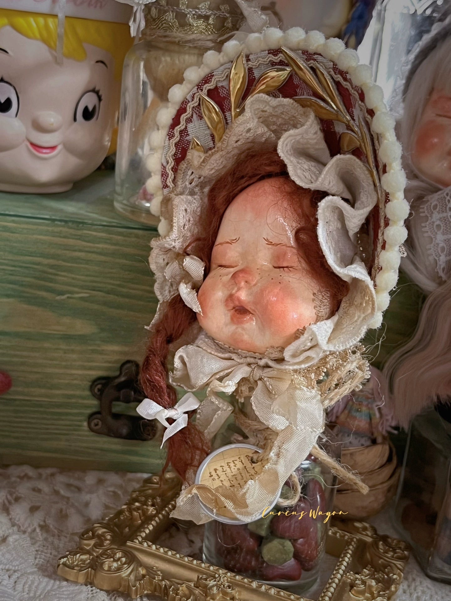 Botella de almacenamiento única con forma de cabeza de muñeca y capota extraíble. Los materiales teñidos a mano muestran un efecto envejecido intencionado.