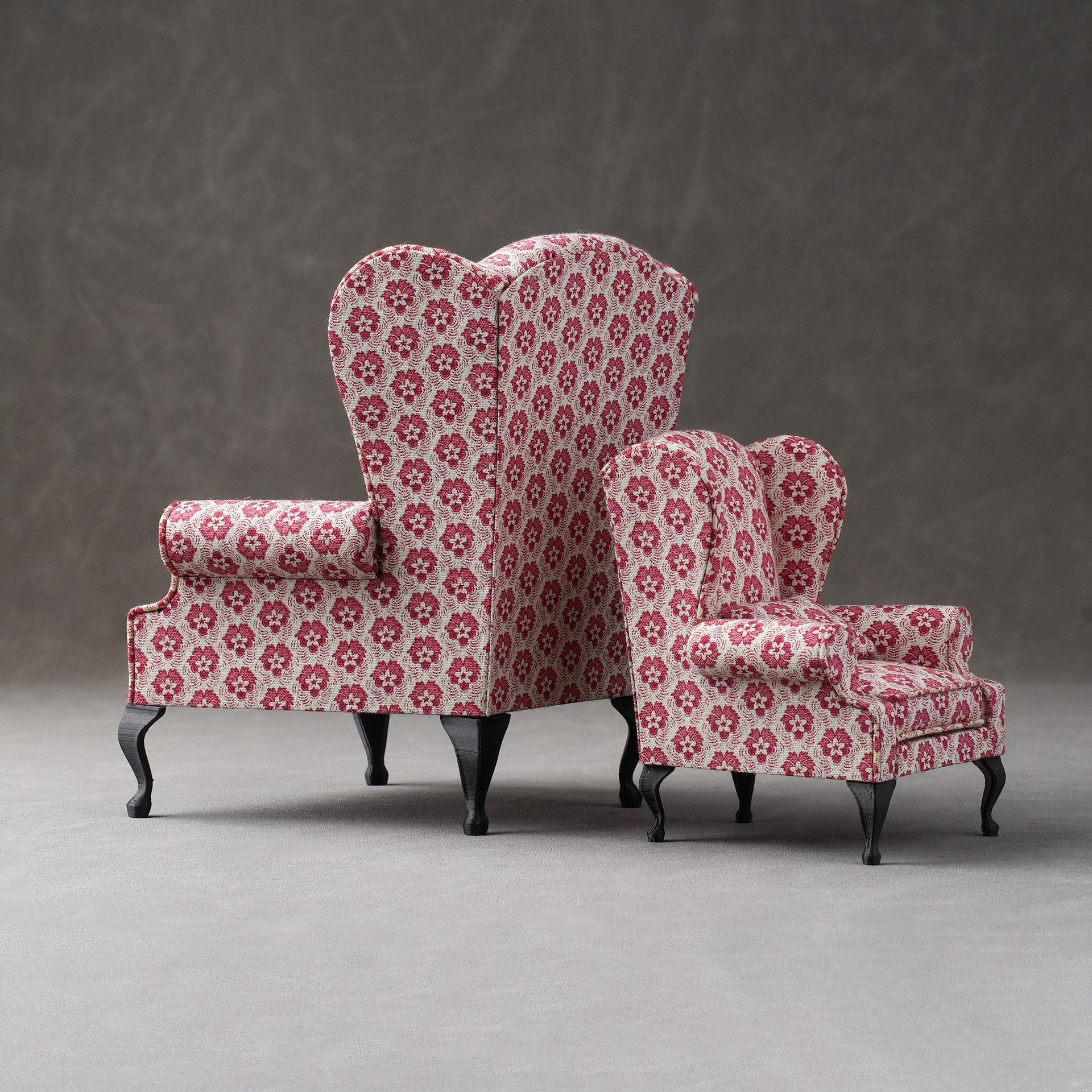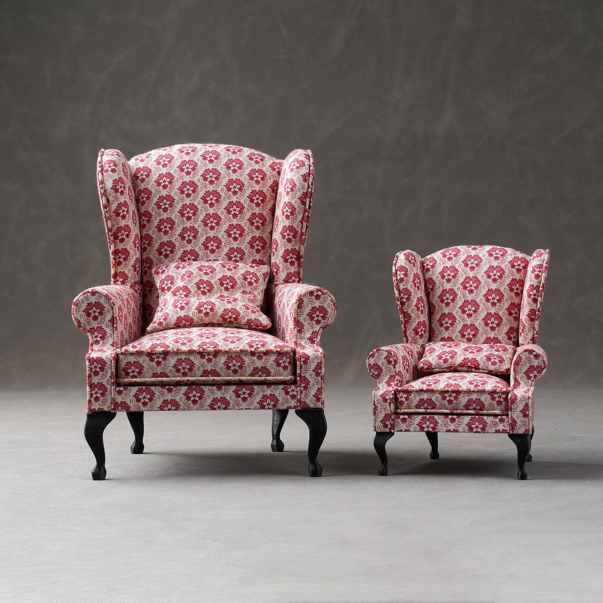 Sillón en miniatura de estilo antiguo en tela estampada rosa, disponible en escalas 1:6 y 1:12 para coleccionistas de casas de muñecas y aficionados a las miniaturas. Esta reproducción detallada presenta elementos de diseño auténticos, perfectos para realzar sus exhibiciones de miniaturas.