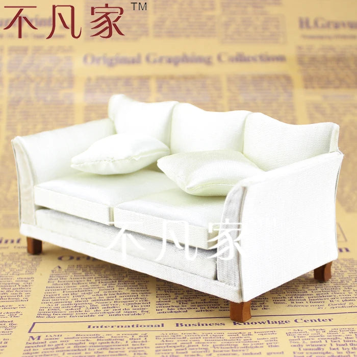 Sofá en miniatura de exquisita elaboración con cojines decorativos para casas de muñecas a escala 1:12. Este delicado mueble presenta una construcción de madera auténtica con detalles precisos.