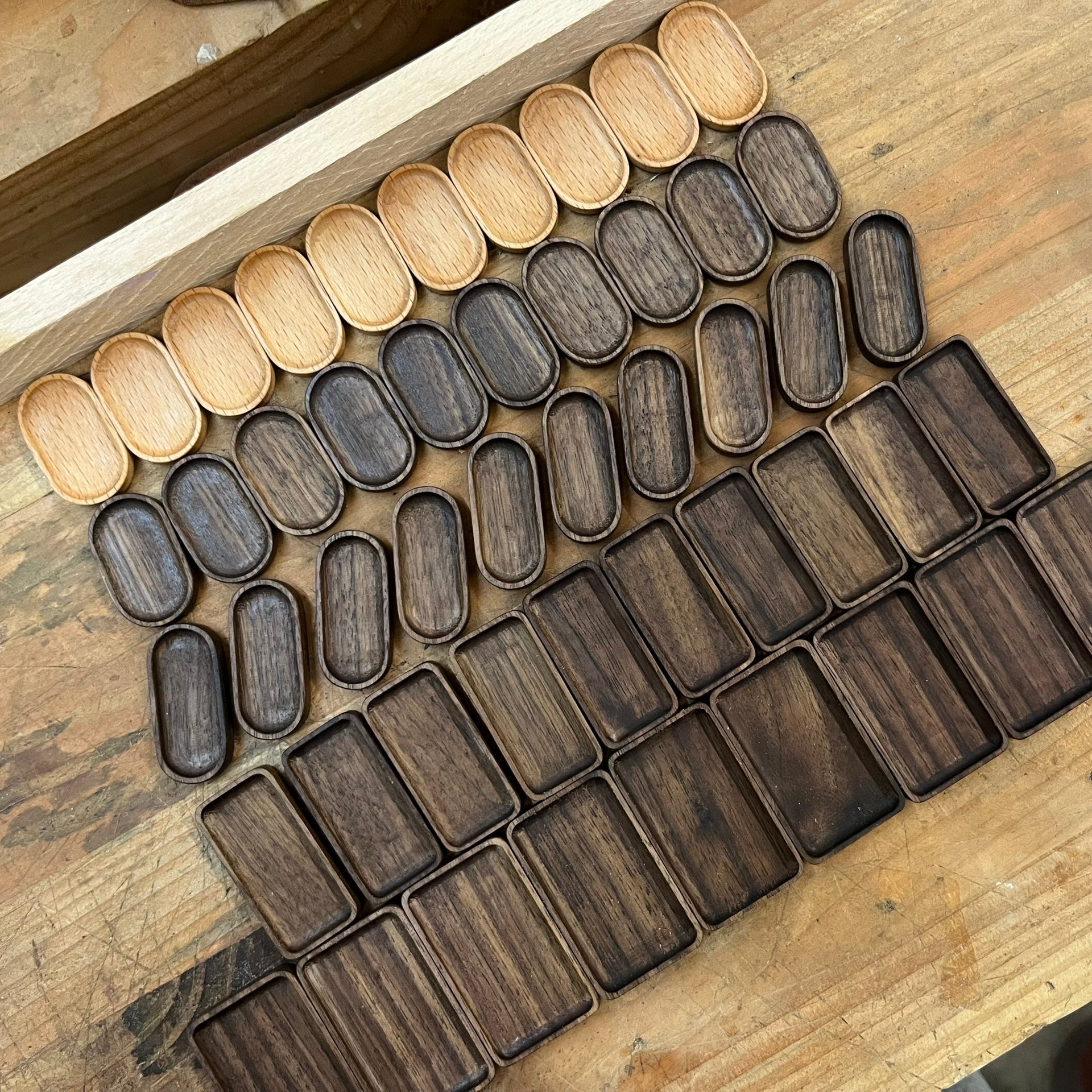 Estas son bandejas pequeñas en miniatura. Las de color oscuro están hechas de nogal negro, mientras que las de color claro están elaboradas con madera de haya. Hay un total de 5 modelos diferentes, y el producto se entrega como un juego completo con una pieza de cada modelo, lo que ofrece un total de 5 bandejas.
