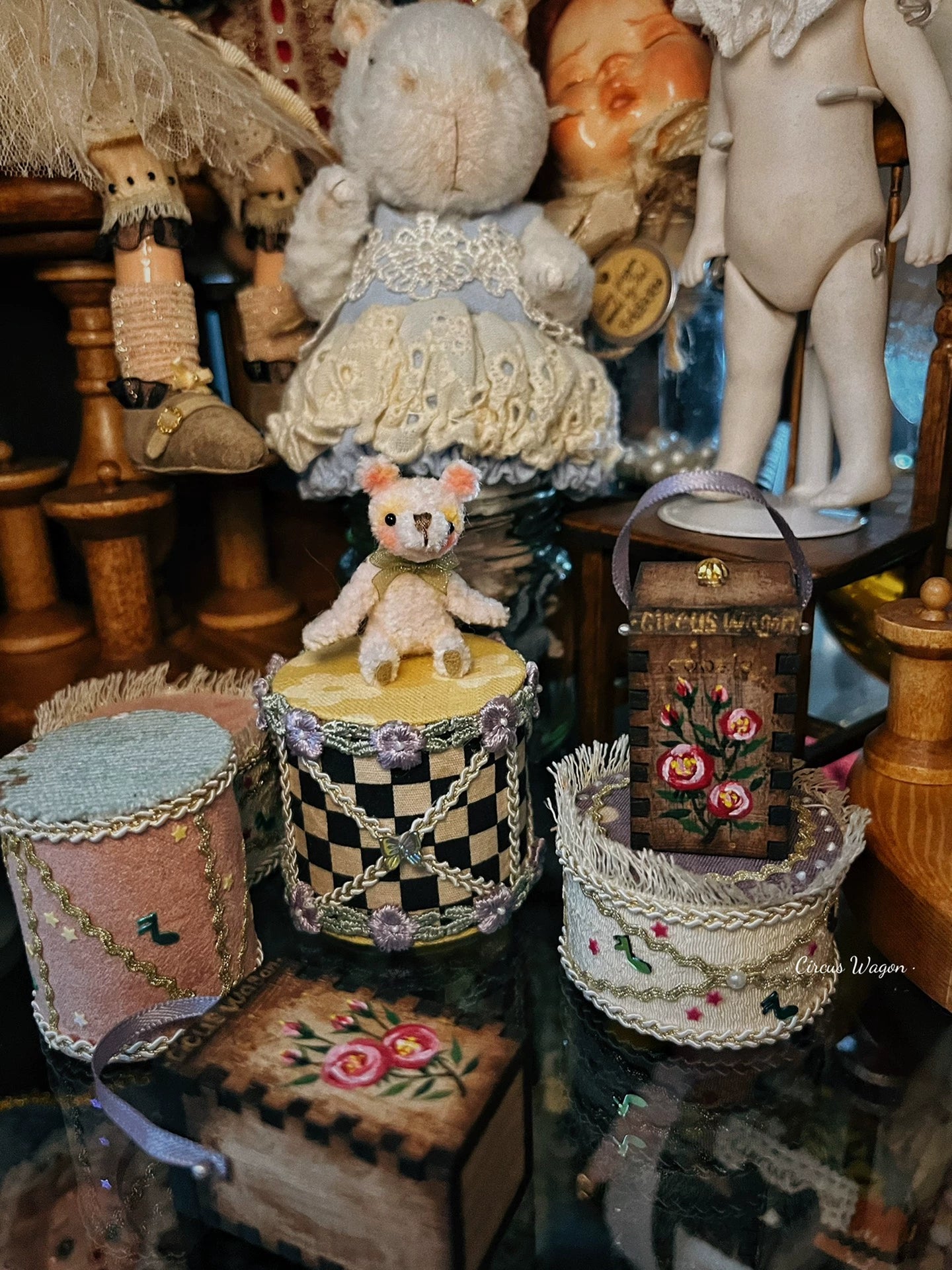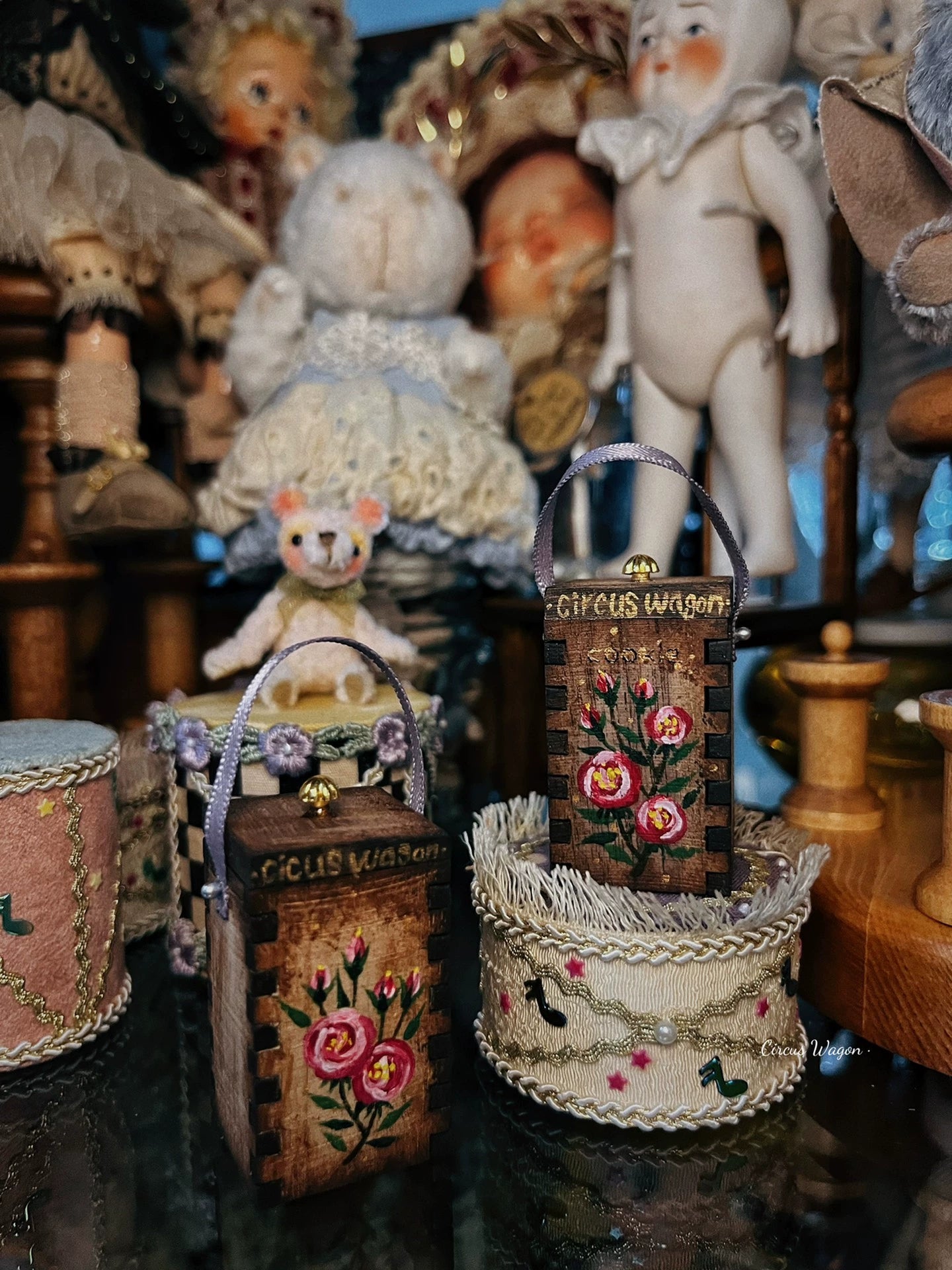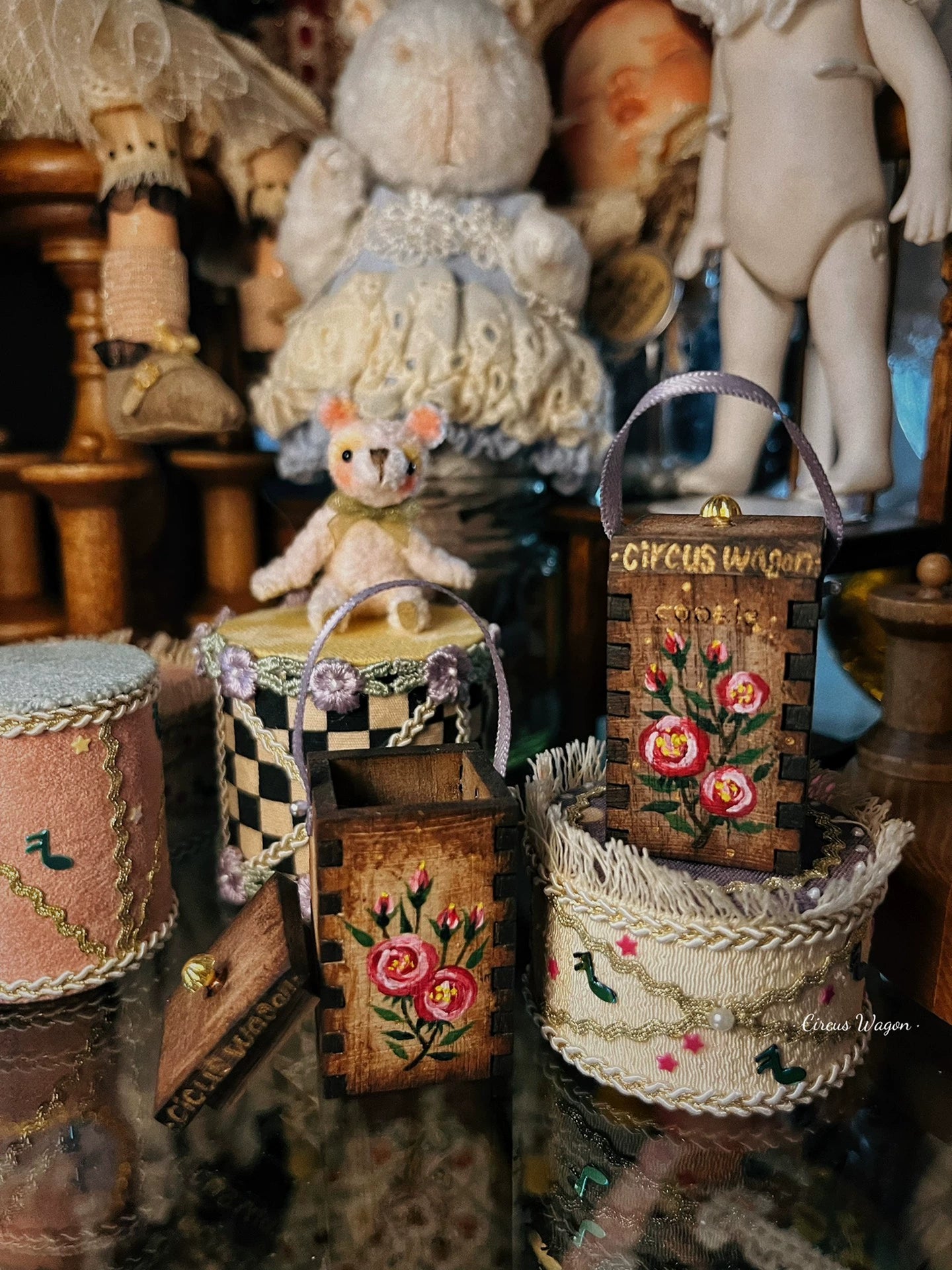 Ensemble de meubles de maison de poupée miniature comprenant un pot à biscuits en bois peint à la main et un compagnon ours, parfait pour les expositions à l'échelle 1:12 avec des détails d'artisanat authentiques.