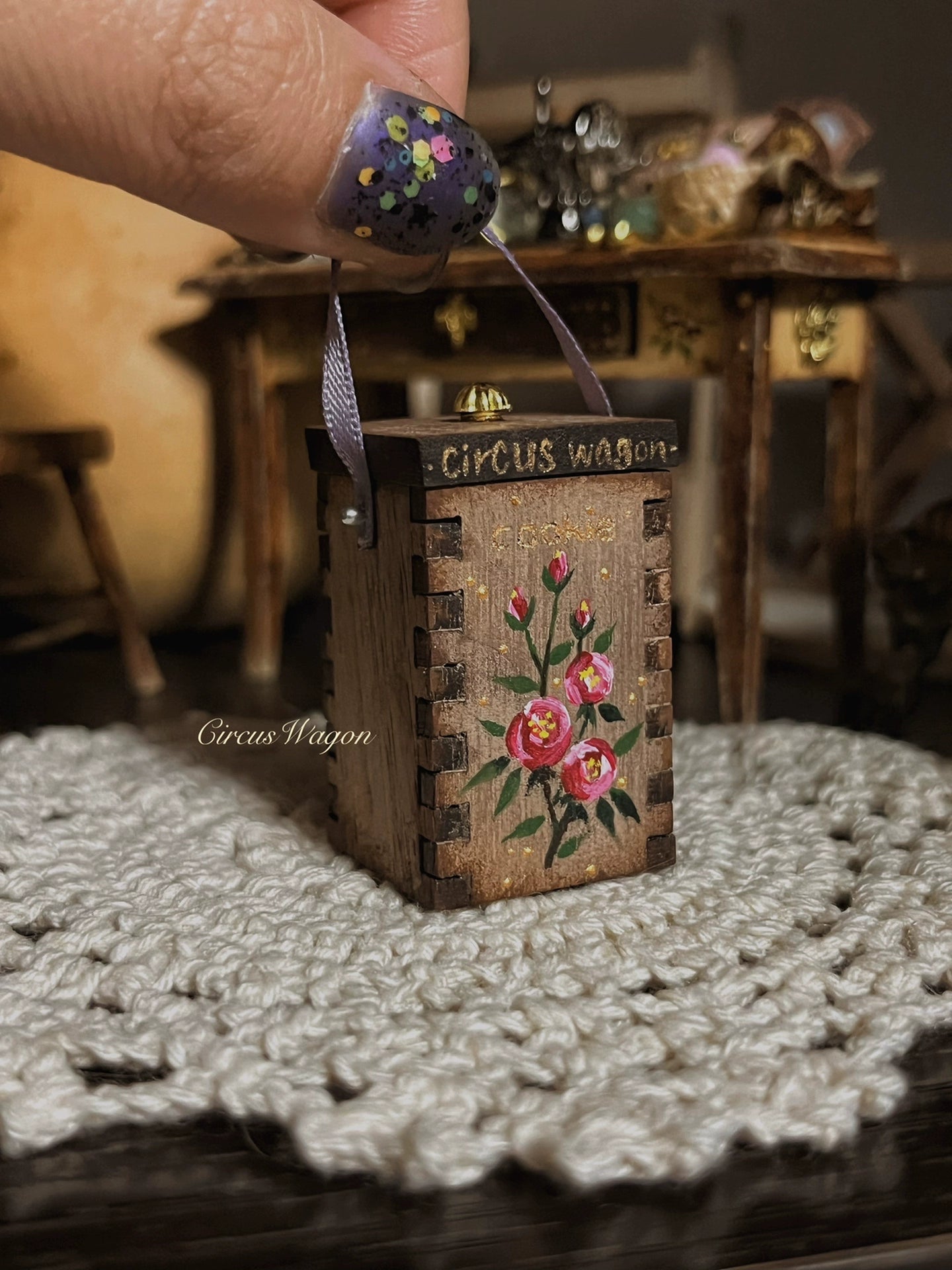 Construction en bois avec détails de menuiserie apparents. La boîte à biscuits présente un motif décoratif peint à la main. Remarque : l'épaisseur du bois limite la capacité de rangement, mais crée des bords de menuiserie visibles et attrayants.