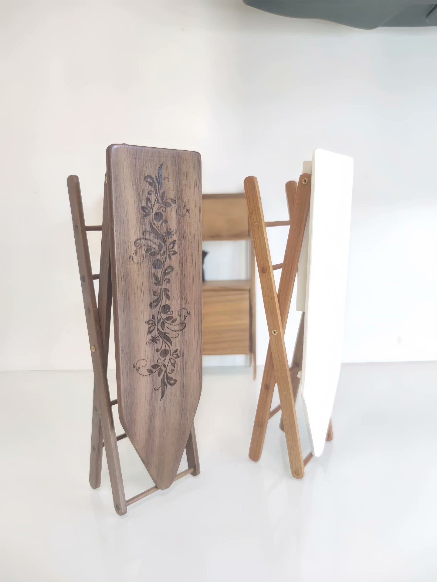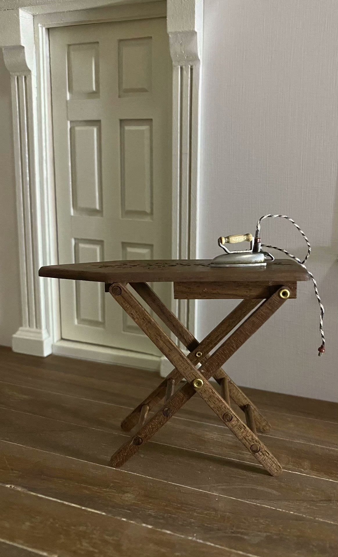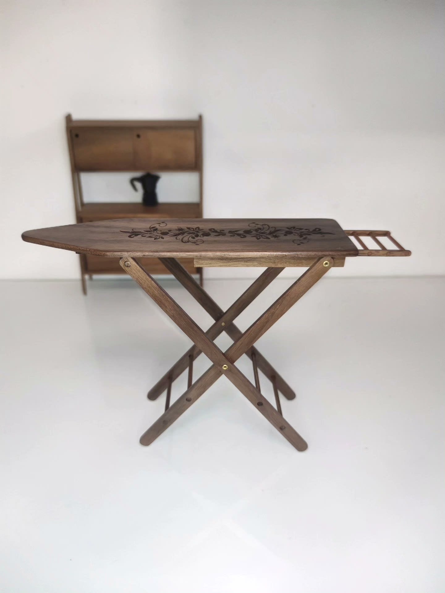 Planche à repasser miniature en bois pour maison de poupées, avec mécanisme de pliage authentique et fonctions réglables. Parfaitement adaptée aux expositions de poupées à l'échelle 1:6 ou 1:12.