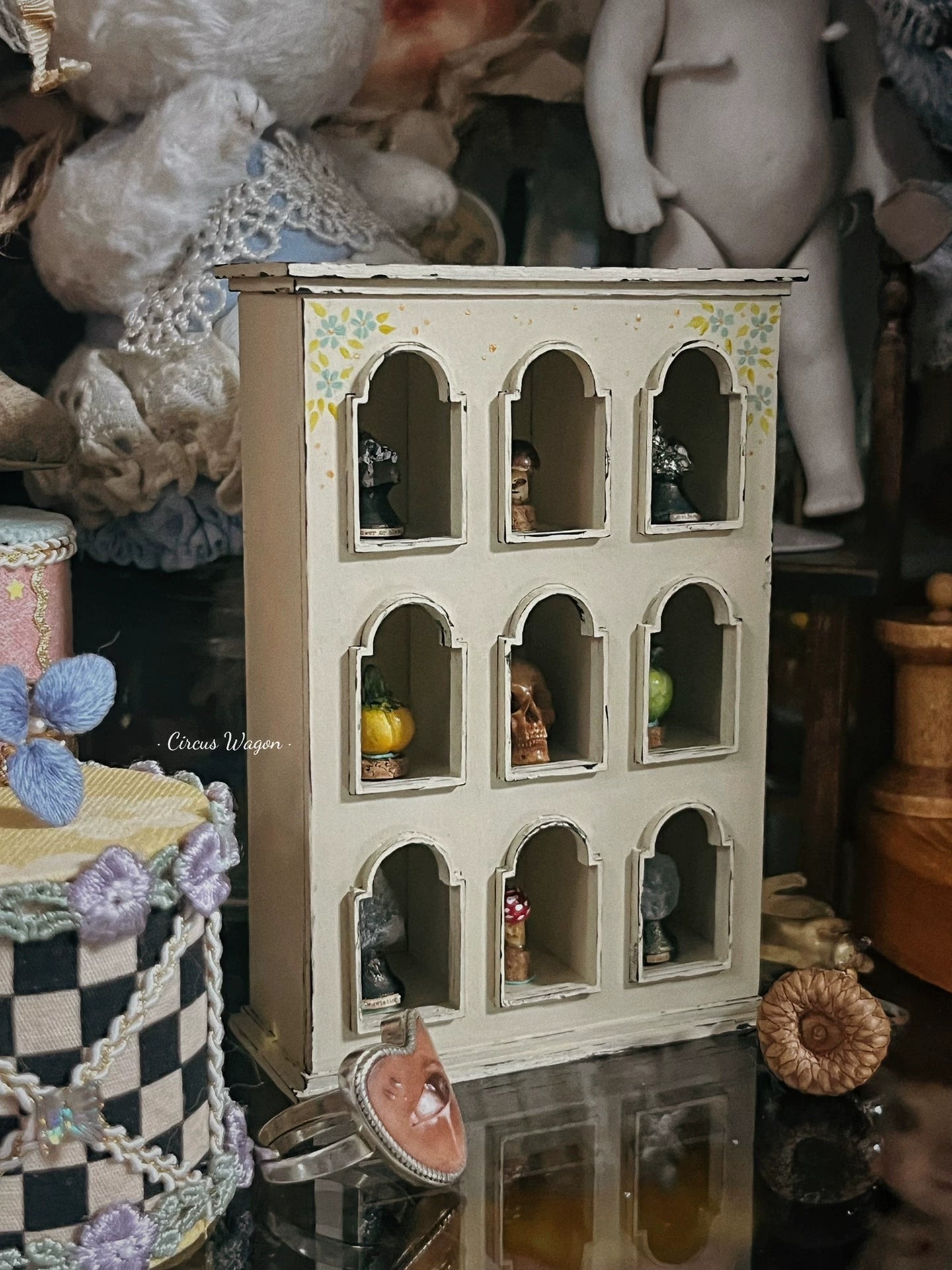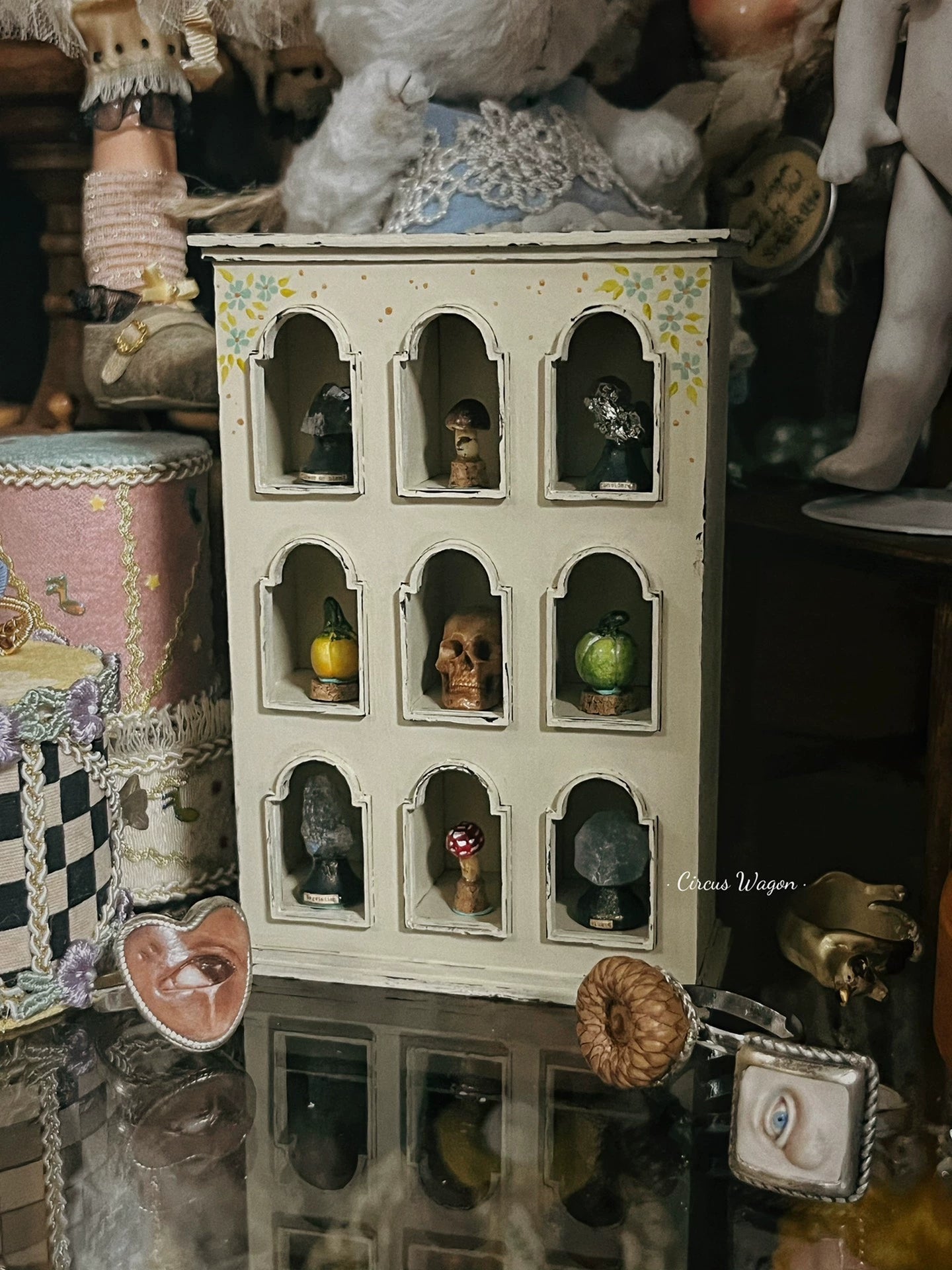 Mots-clés : échelle 1:12, miniature de maison de poupée, vitrine, collection de minéraux, fait main, finition vieillie, blanc ivoire