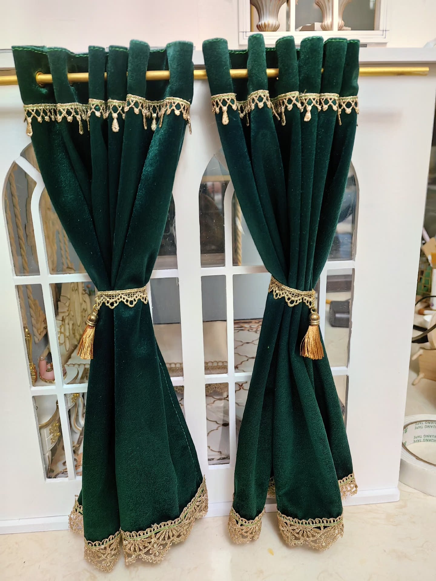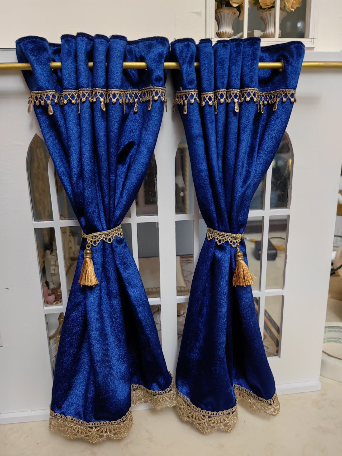 Rideaux miniatures en velours de haute qualité pour la décoration de votre maison de poupée. Élégants motifs de style royal, ils sont disponibles en plusieurs coloris. Dimensions personnalisées disponibles sur demande.