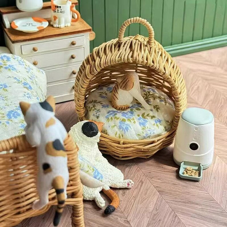Nid pour chat et mangeoire miniatures en vigne tissée à l'échelle 1:6 - Accessoire pour maison de poupées BJD, Blythe et GSC