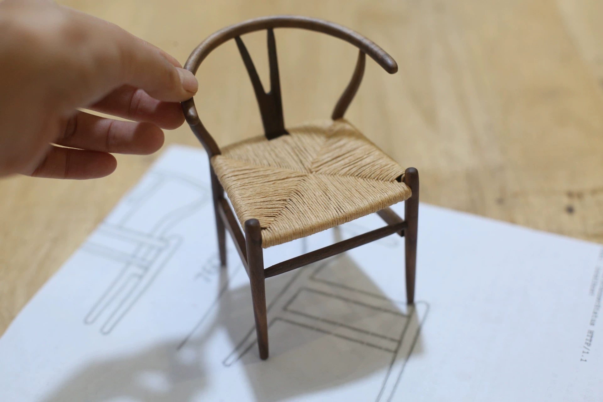 This exquisite 1:6 scale miniature Wishbone chair brings Danish design elegance to your dollhouse. Perfectly sized for dollhouse decor, this tiny replica features the iconic curved back and organic form of the classic Wishbone chair. Crafted with attention to detail, it adds sophisticated charm to any miniature setting.