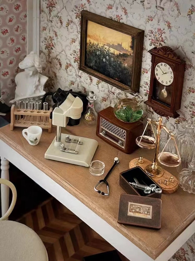 Ensemble de matériel de laboratoire miniature à l'échelle 1:12 comprenant béchers, tubes à essai et instruments scientifiques. Idéal pour les expositions en maison de poupée, les maquettes ou les dioramas éducatifs. Construction en résine polymère très détaillée aux finitions réalistes. Objet de collection pour les passionnés de sciences et les collectionneurs de miniatures.