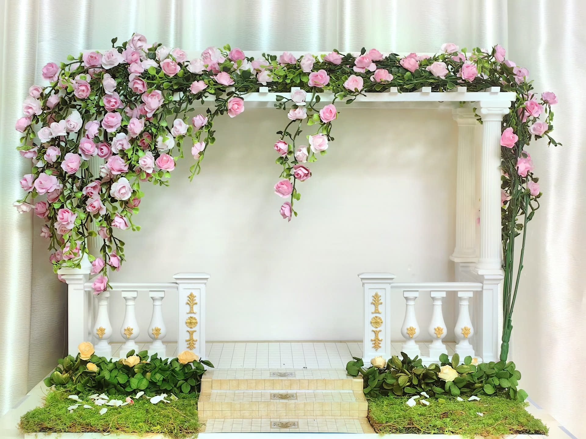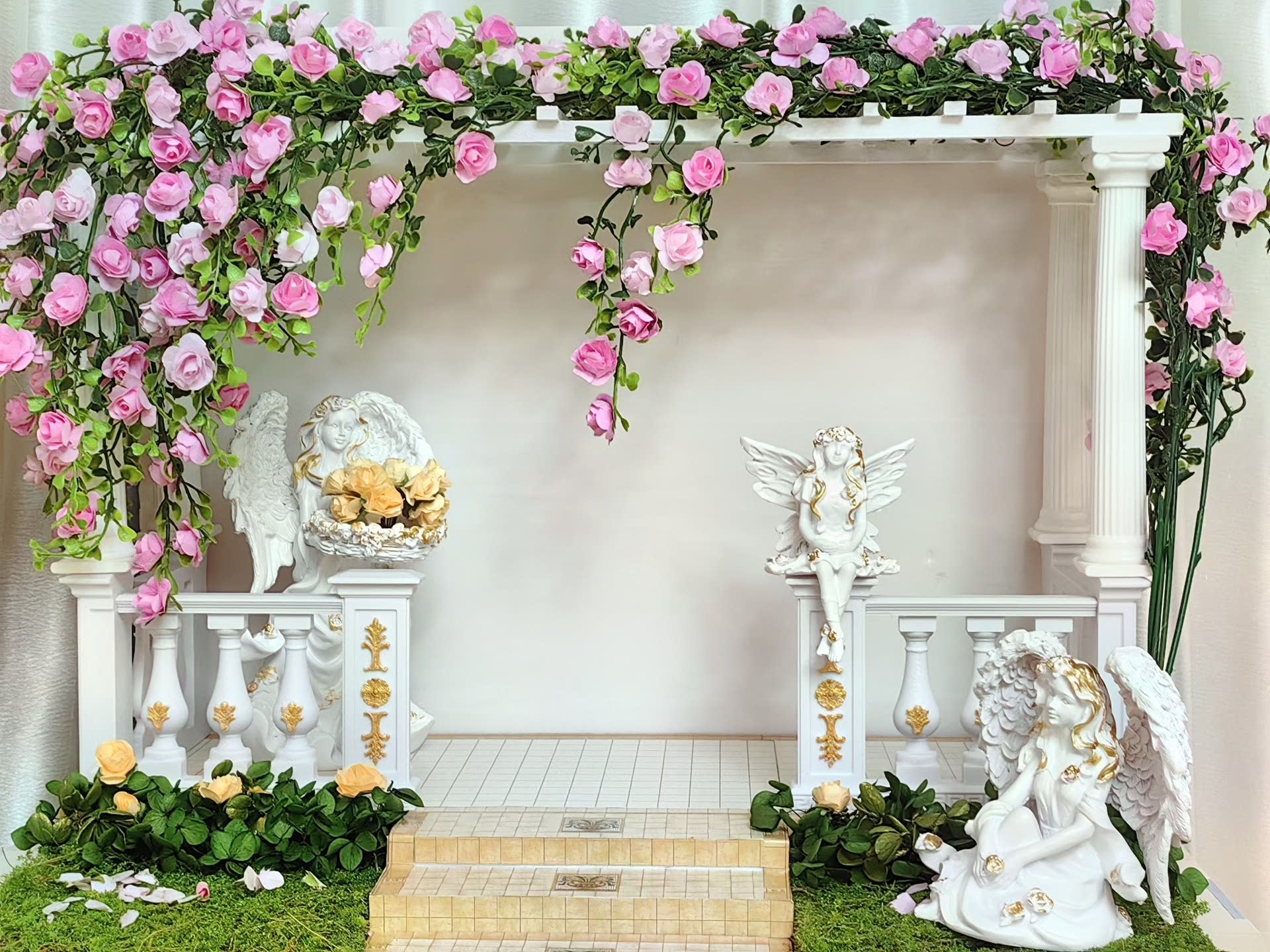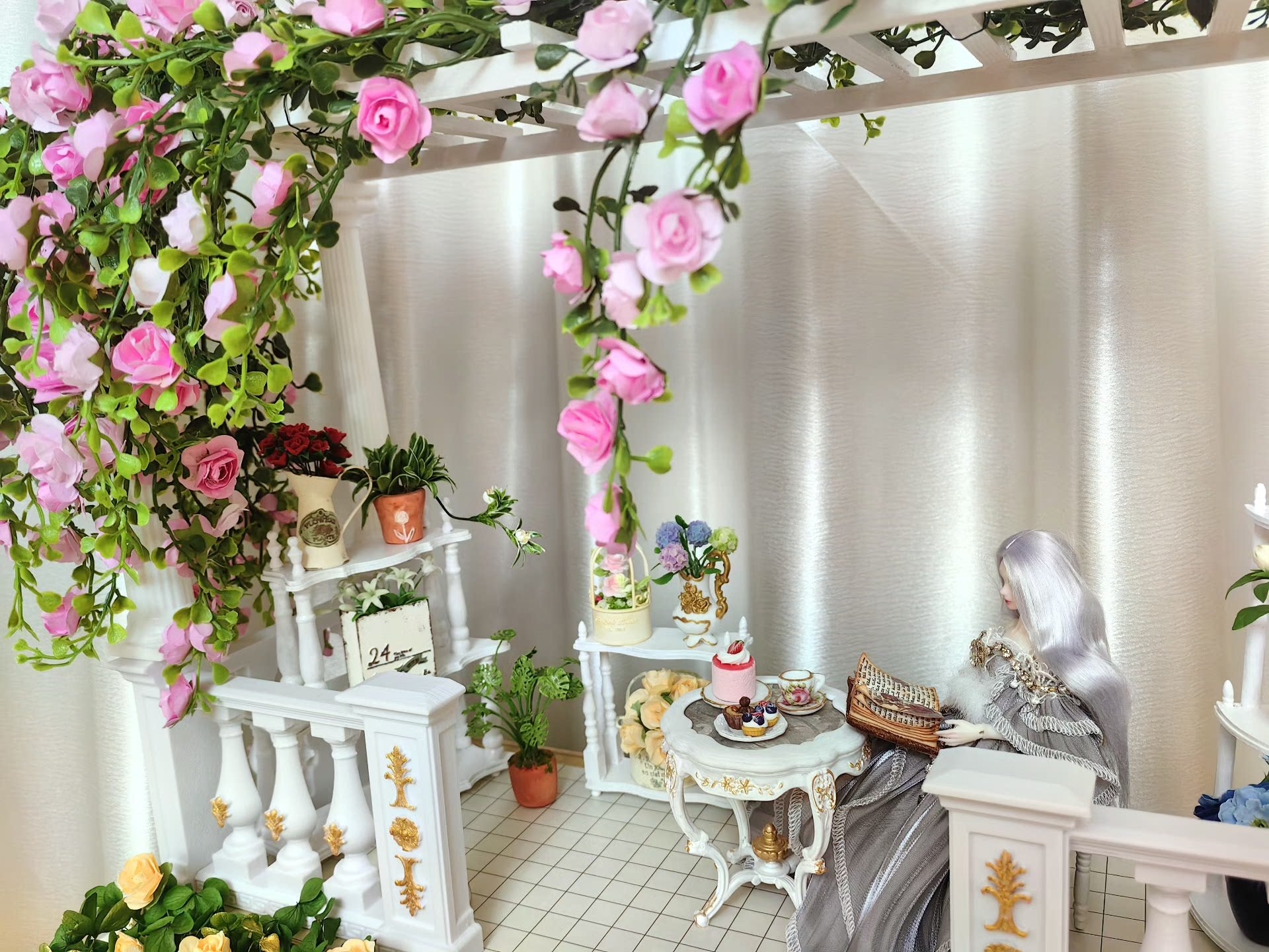 Handcrafted miniature garden courtyard designed for 1:12 scale dollhouse scenes. Perfect for photography setups including tea party scenes. Measures 40cm in length and 35cm in height.