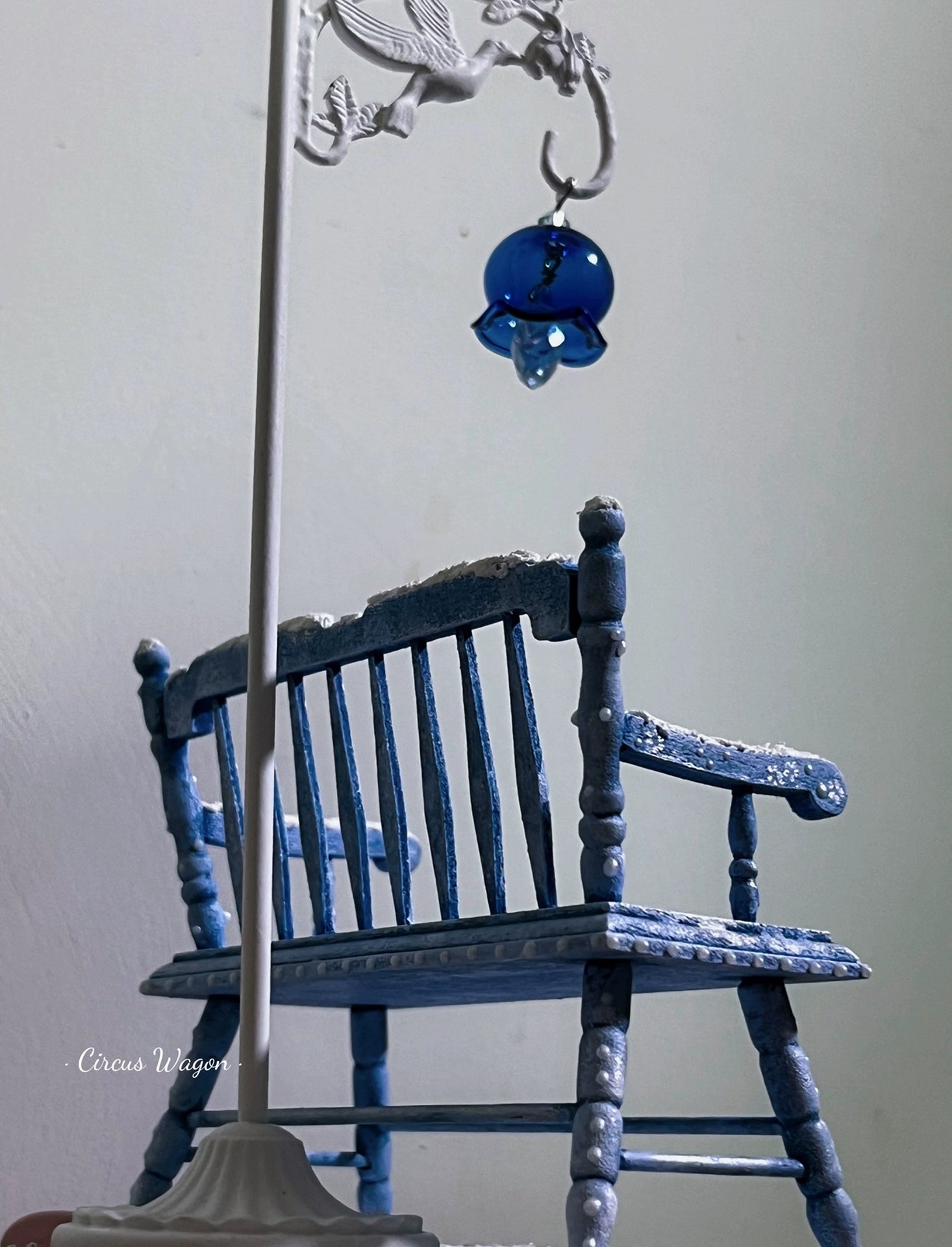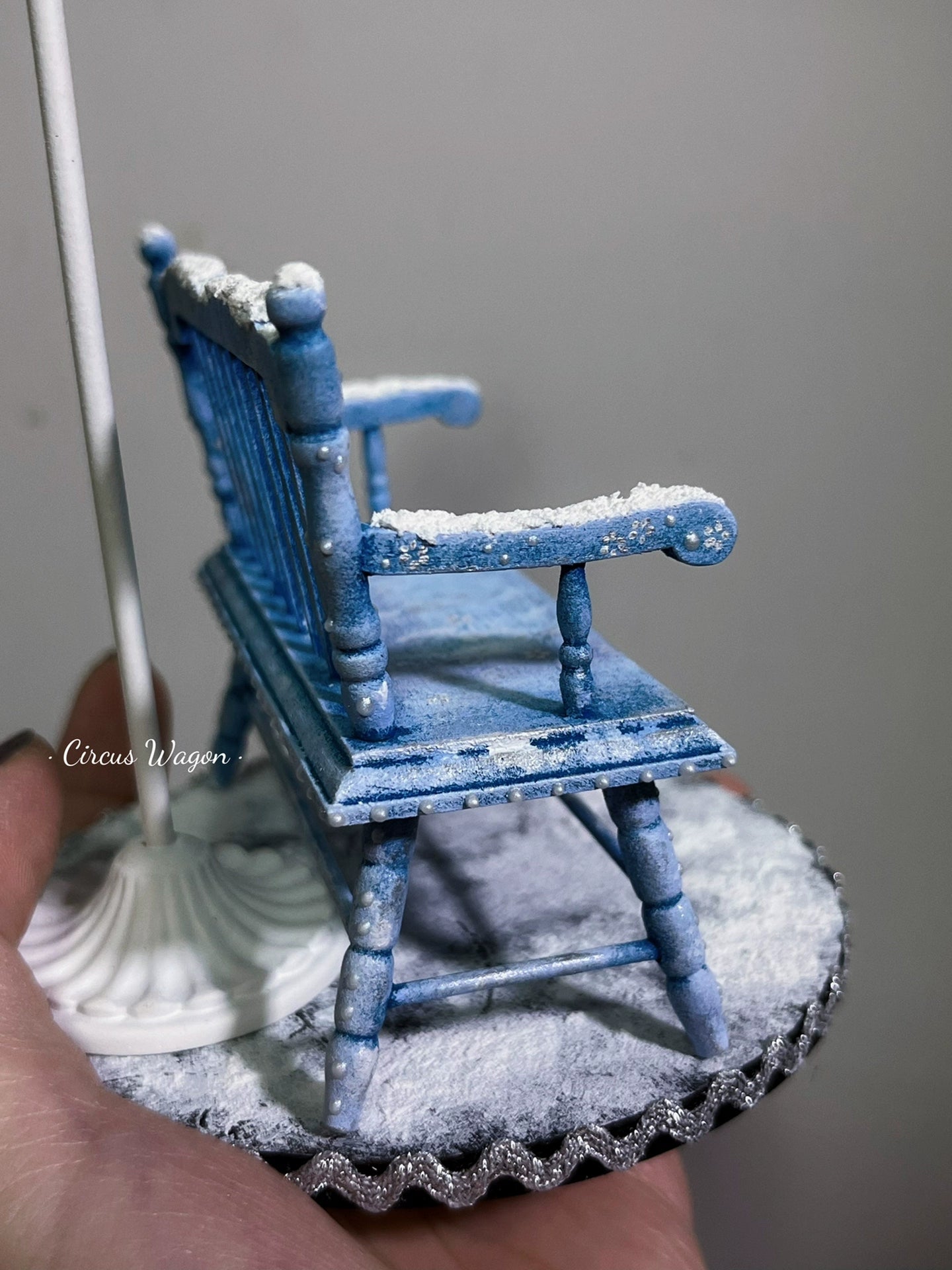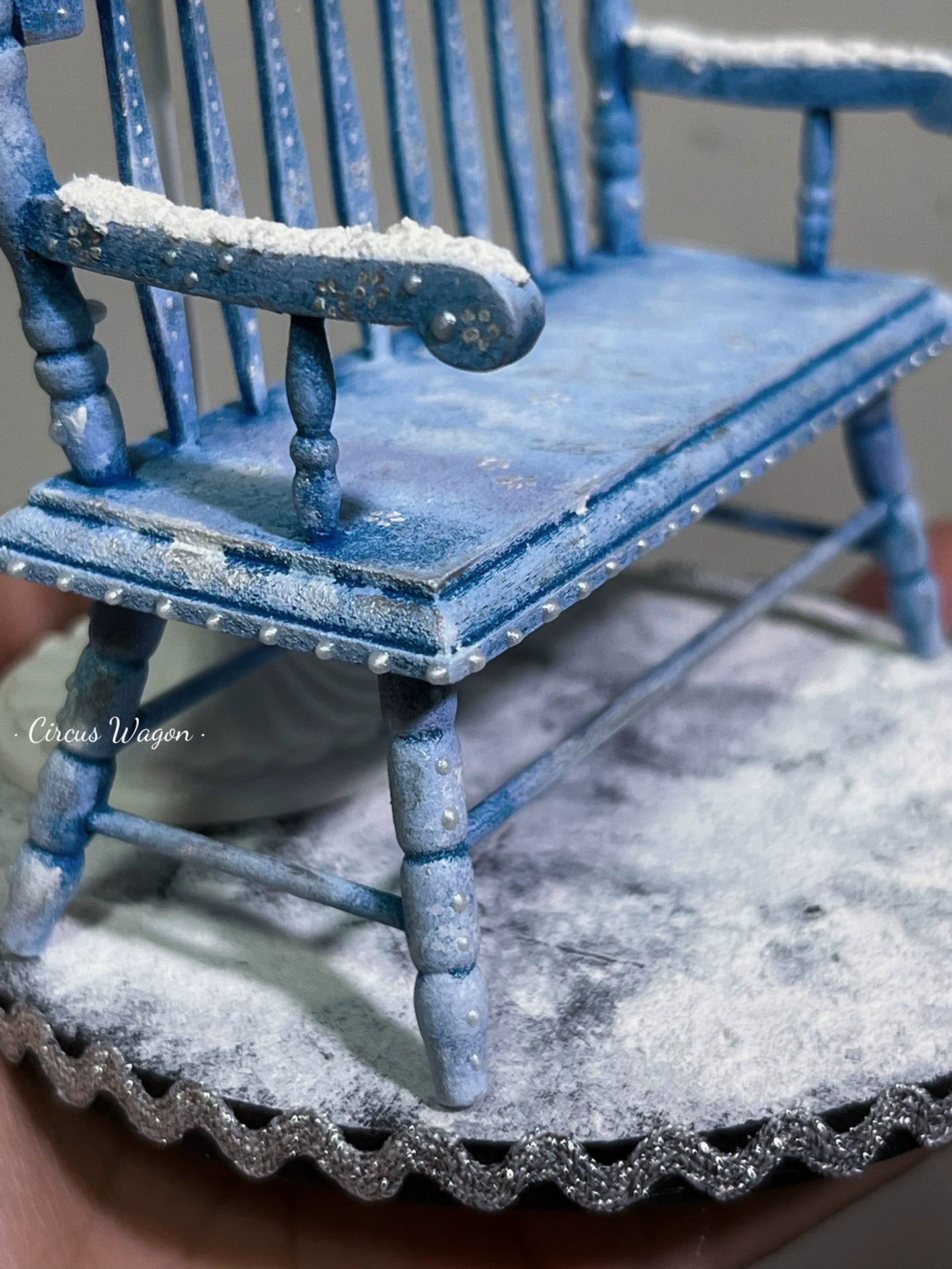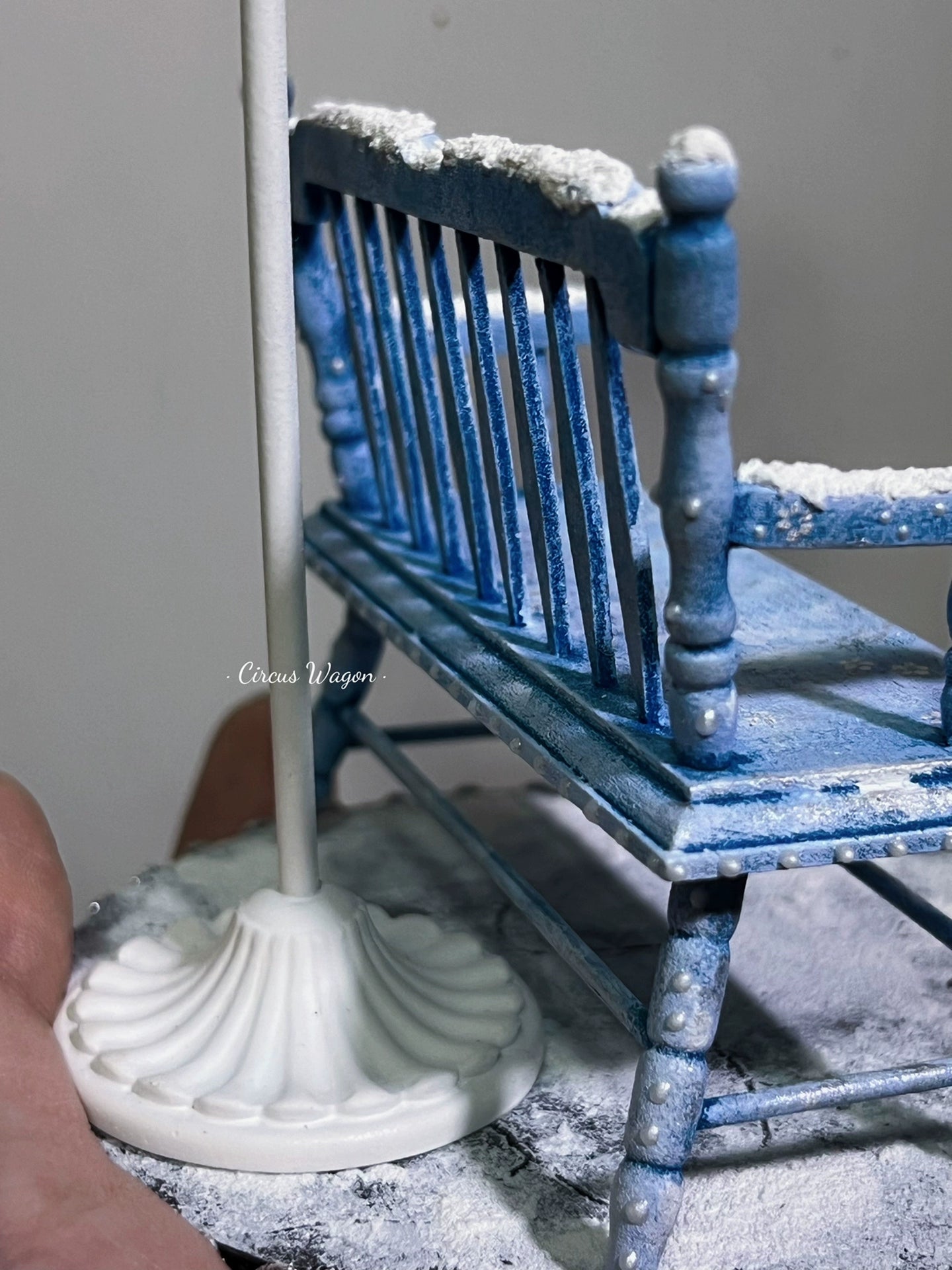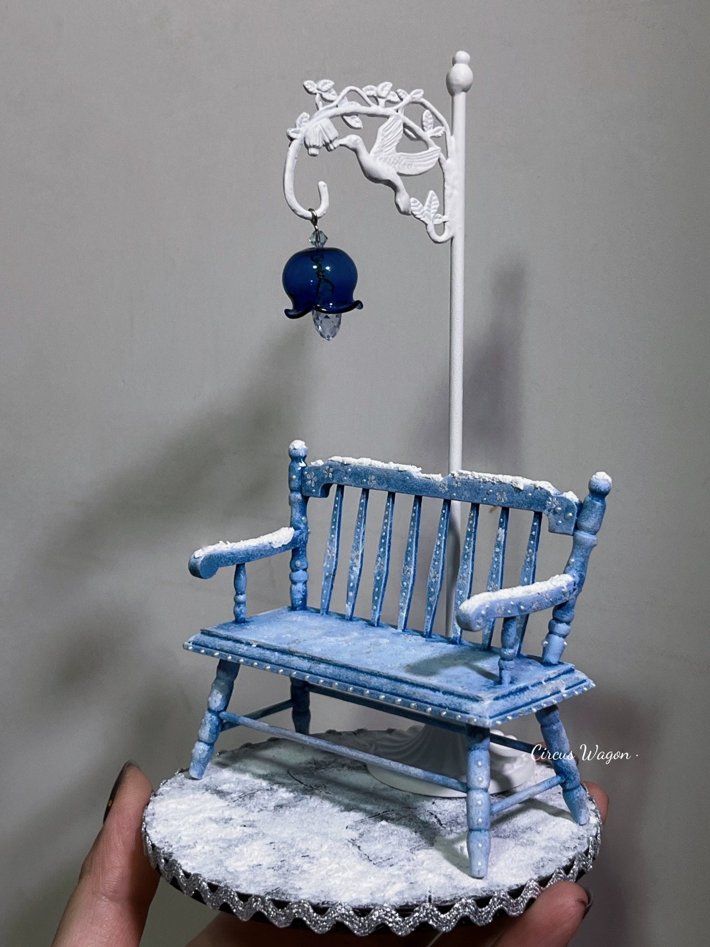 Miniature winter scene dollhouse set featuring hand-painted wooden bench, glass lamp post, and snow-covered base for 1:12 scale display.