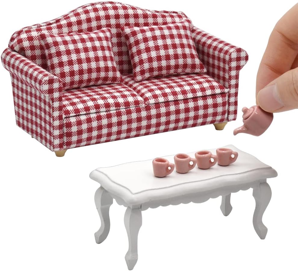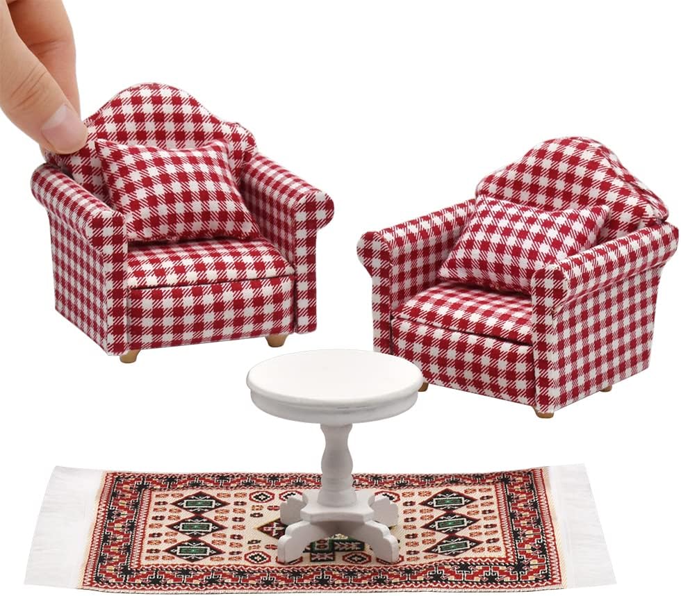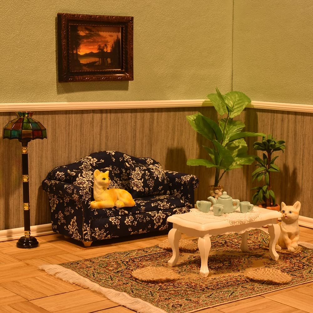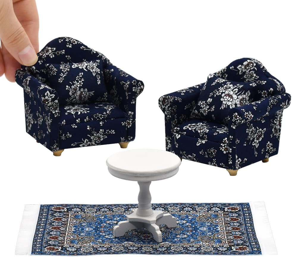 Enhance your dollhouse living room with this exquisite 1:12 scale wooden cabinet miniature furniture set. Featuring charming blue and white floral armchairs, a cozy sofa with pillow, elegant end table, and decorative rug, this collection brings realistic detail to your miniature world. Perfect for dollhouse enthusiasts and collectors seeking high-quality, scaled furnishings.