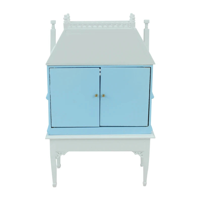 This exquisite 1:144 scale miniature dollhouse features a charming blue house shape, perfectly displayed on a 1:12 scale table with miniature furniture. Ideal for collectors and hobbyists, this detailed piece adds a whimsical touch to any dollhouse scene or miniature display.