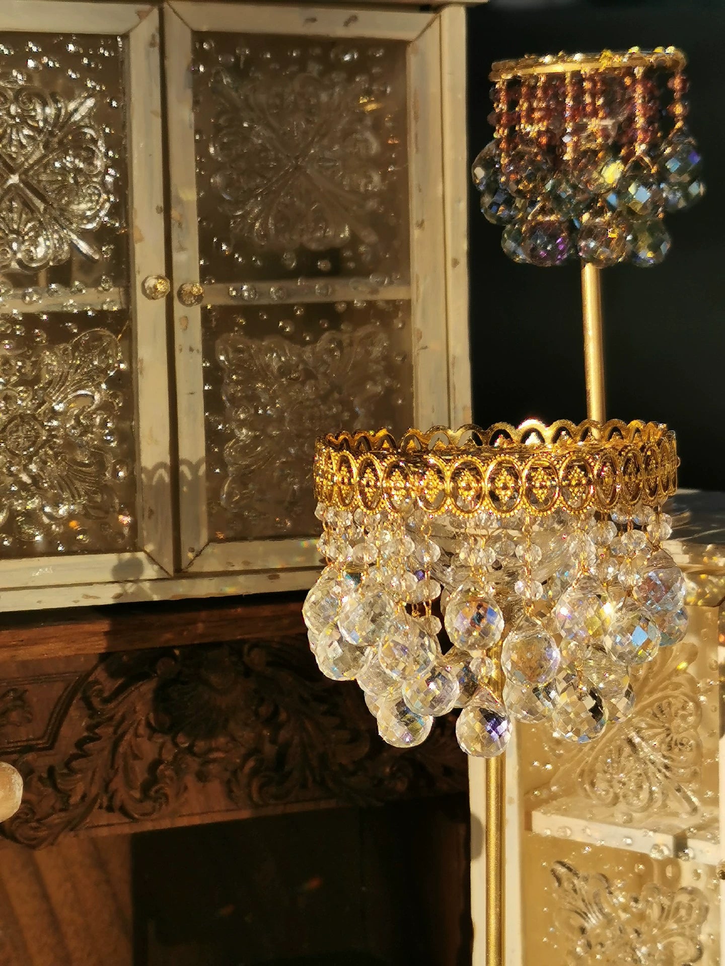 Illuminate your miniature world with this exquisite 1:6 scale BJD crystal chandelier. Perfect for Blythe dolls, OB11 figures, and dollhouse enthusiasts, this elegant table or floor lamp adds realistic lighting to any tiny scene. Featuring delicate crystal details and charming vintage design, it creates a magical ambiance for your doll displays and photography setups.