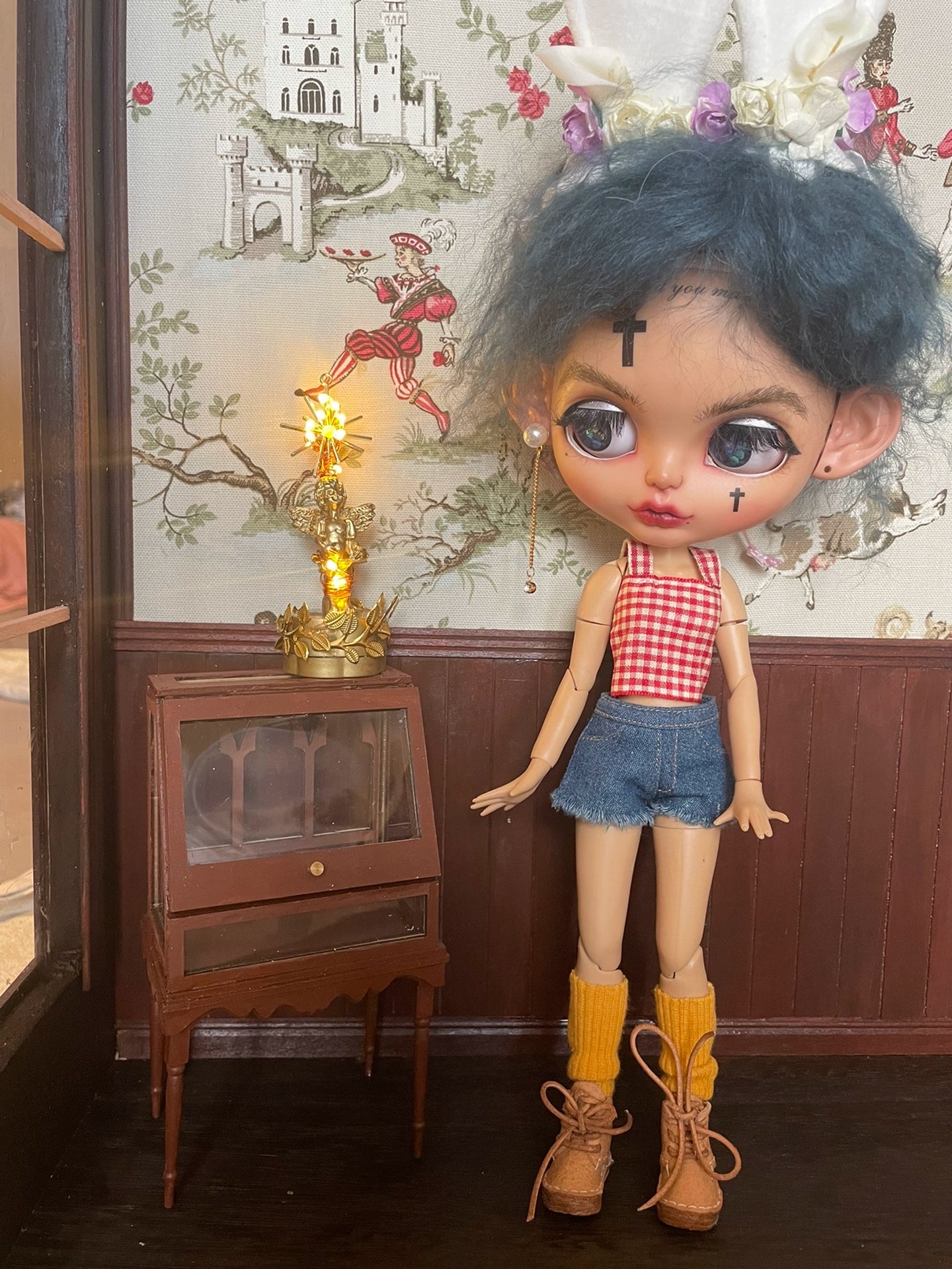 Enhance your Blythe dollhouse with this exquisite 1:6 scale miniature European angel table lamp. Perfectly sized for dollhouse decor, this delicate accessory adds elegant charm to any miniature setting. Crafted with intricate details, it creates a realistic lighting ambiance for your tiny home displays.
