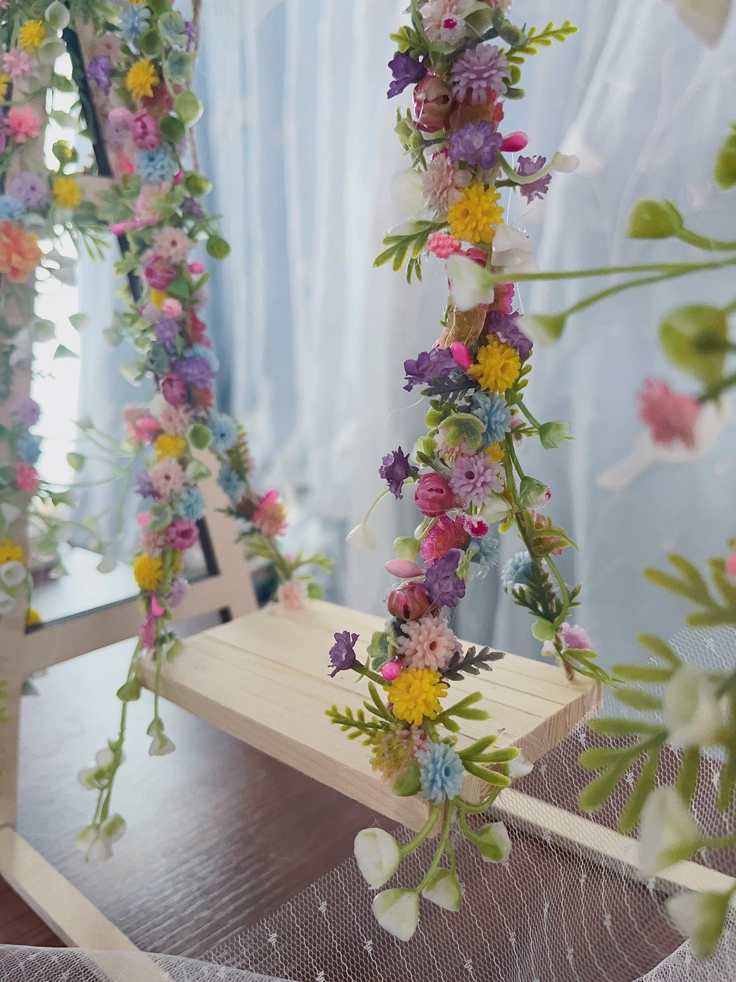 Enhance your dollhouse playroom with this charming 1:6 scale miniature swing set. Perfect for Barbie and other fashion dolls, this detailed accessory adds realistic outdoor fun to your doll's world. Made with durable materials for long-lasting play.