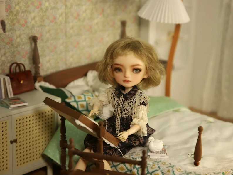 Enhance your dollhouse decor with this exquisite 1:6 scale miniature vintage French embroidery shelf. Perfect for BJD, Blythe, and cross stitch room displays, this delicate DIY accessory adds charming European flair to any tiny scene. Crafted with intricate details, it's ideal for miniature collectors and hobbyists seeking authentic vintage dollhouse furnishings.